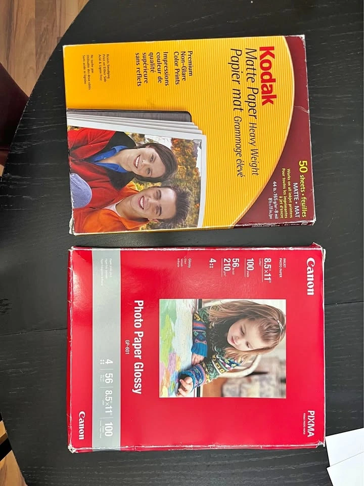 Selling extra photo papers. Kodak Matte Photo Paper – 30 sheets. Canon Inkjet Photo Paper – 60 sheets. Great for printing photos, school projects, or crafts. Both in good condition and unused. Selling as a bundle.