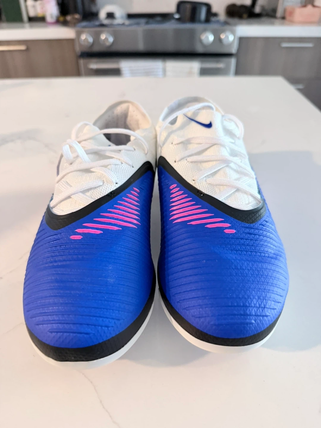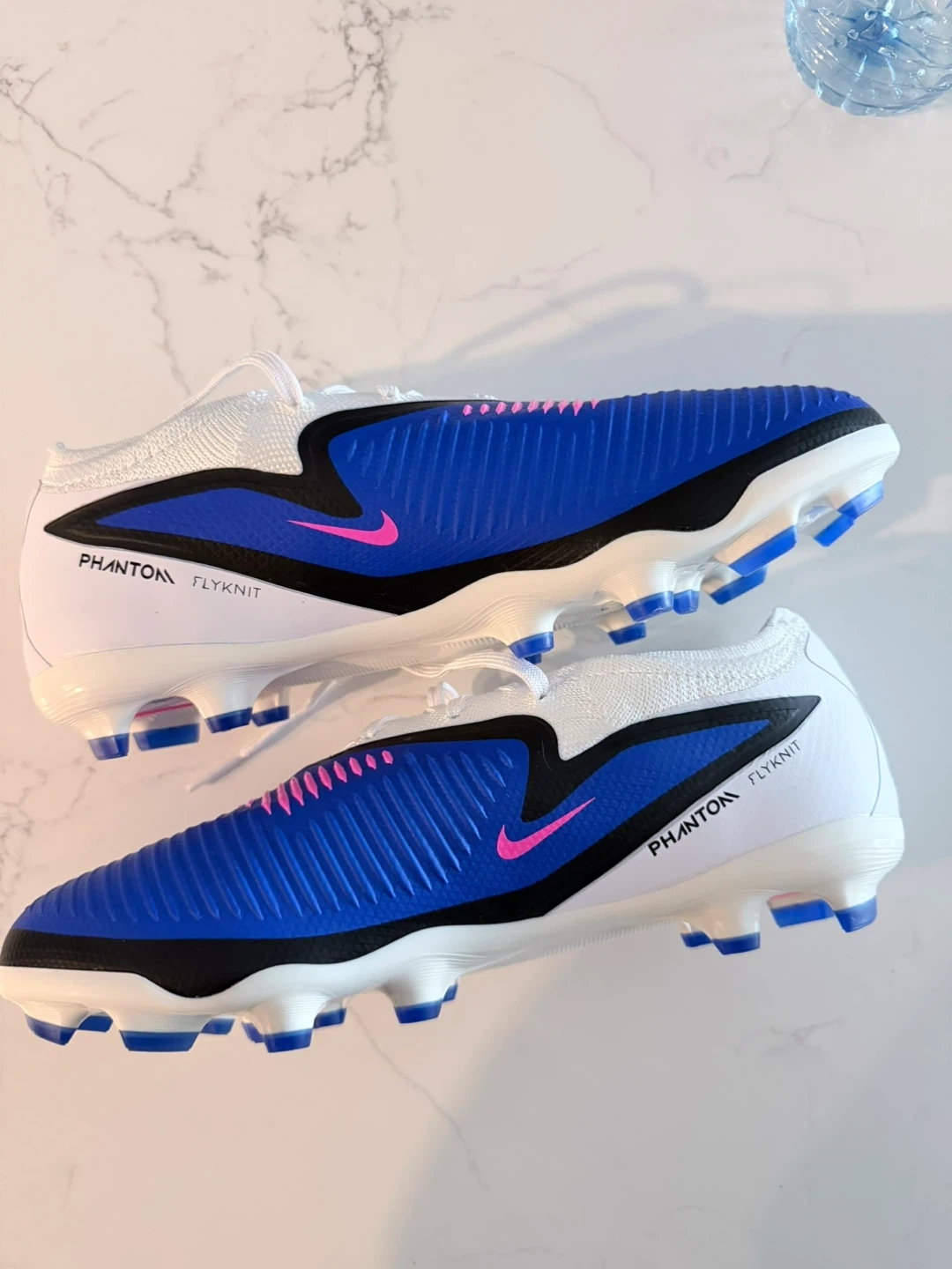 cleats come in a vibrant blue, white, and pink colourway. They're designed for performance on the field. The Flyknit construction offers a snug, sock-like fit.