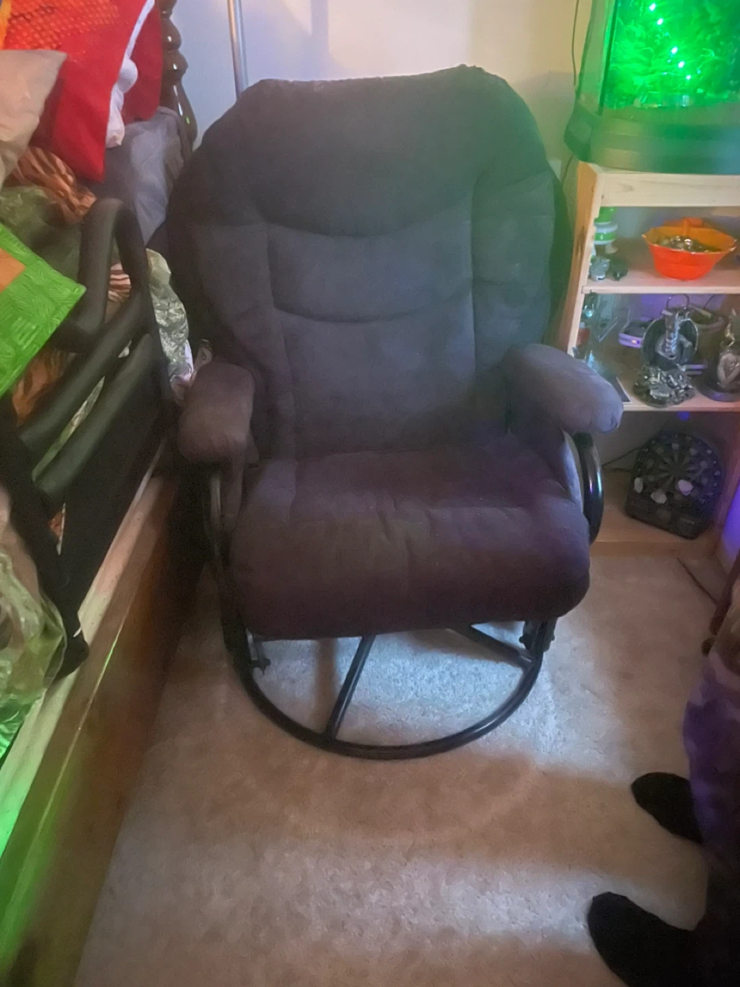 This is a comfortable dark grey swivel glider chair. It's upholstered in a soft fabric and features a padded seat and back. The chair has a metal base that allows it to swivel and glide smoothly. It's perfect for a living room or den!