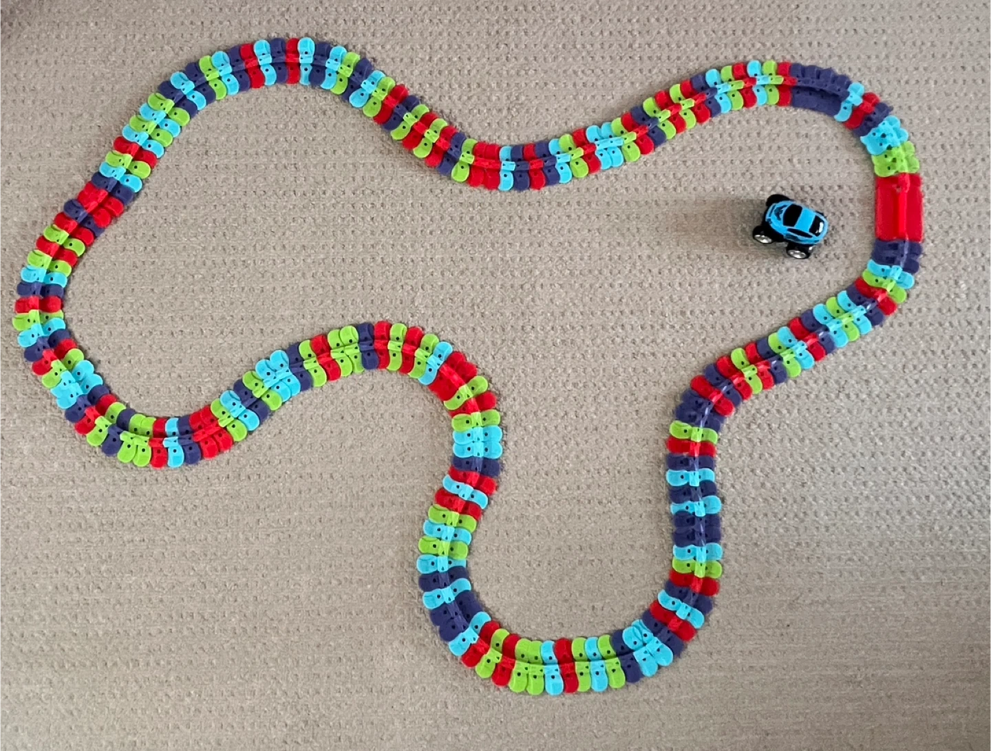 Flexible, colourful race track with pieces that easily click together. Includes a blue race car that lights up and glows in the dark.