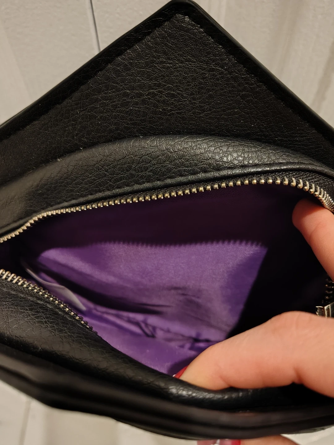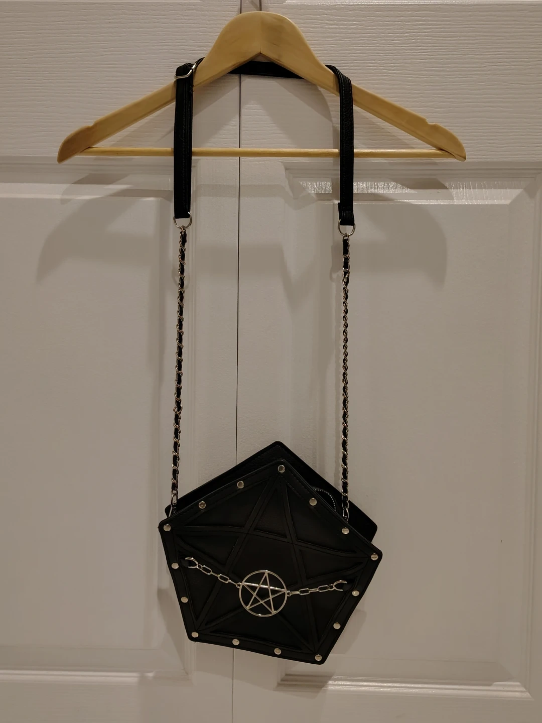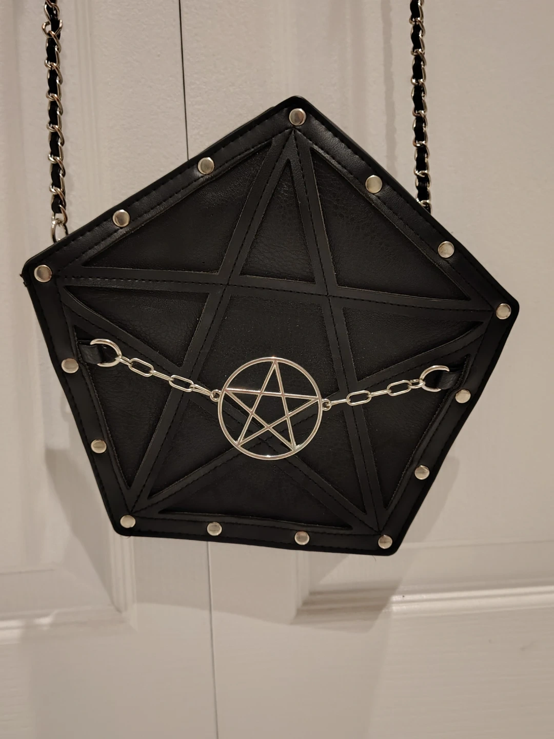 Cool black pentagram-shaped crossbody purse. It's made of faux leather with silver hardware and a detachable chain strap. The interior is lined with purple. It's a unique accessory for any alternative style! Used once but I have other bags I use so I never reach for it. Perfect for this upcoming eclipse