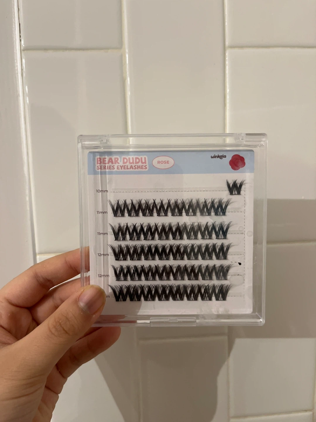 These are cluster false eyelashes from the Winkla Bear Dudu Series in the 'Rose' colour. They come in various lengths including 10mm, 11mm, and 12mm. Application and removal instructions are provided on the packaging.