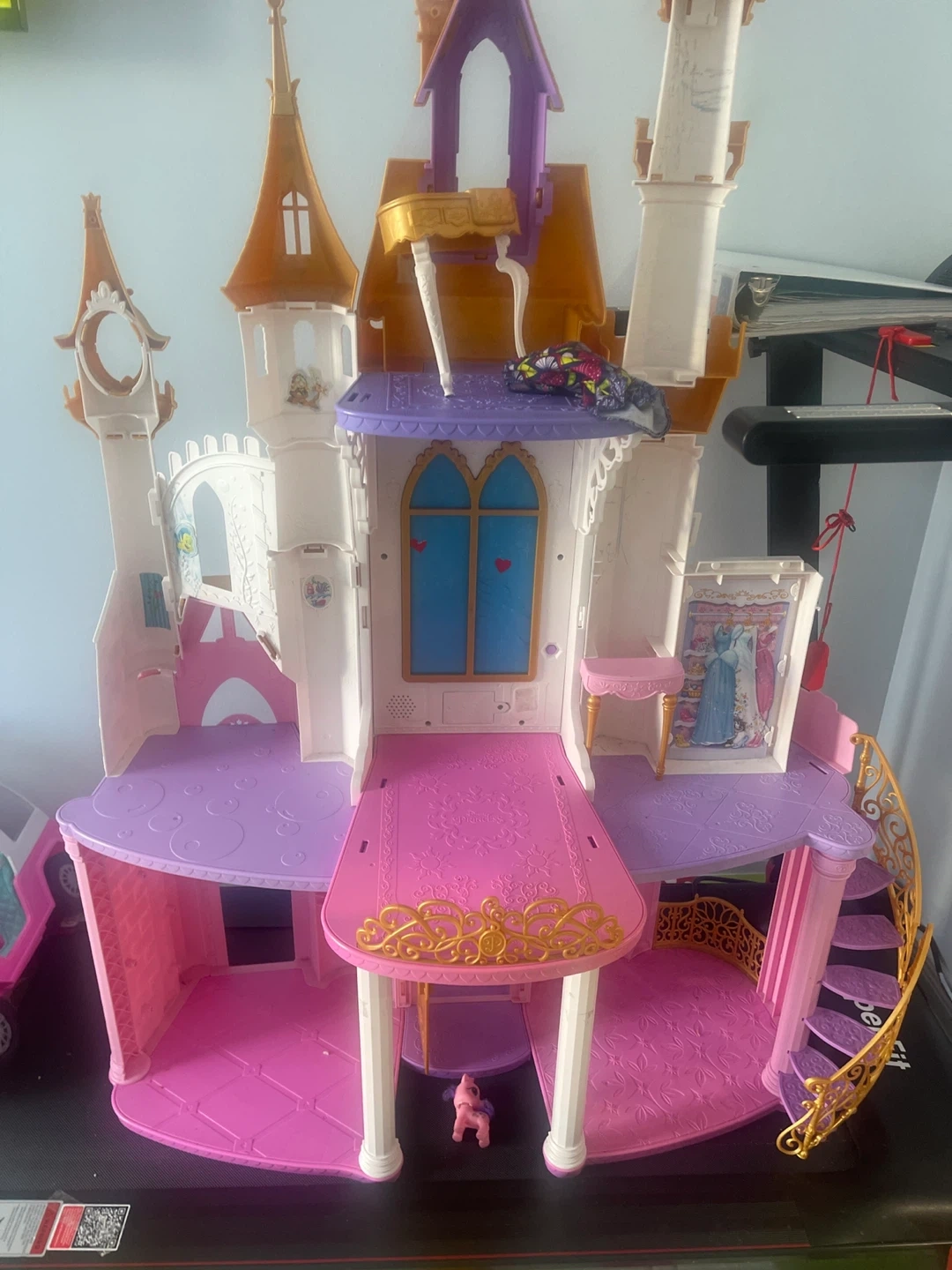 This Disney Princess castle playset is pink and purple with gold accents. It features multiple levels, balconies, and a grand staircase. Perfect for imaginative play!
