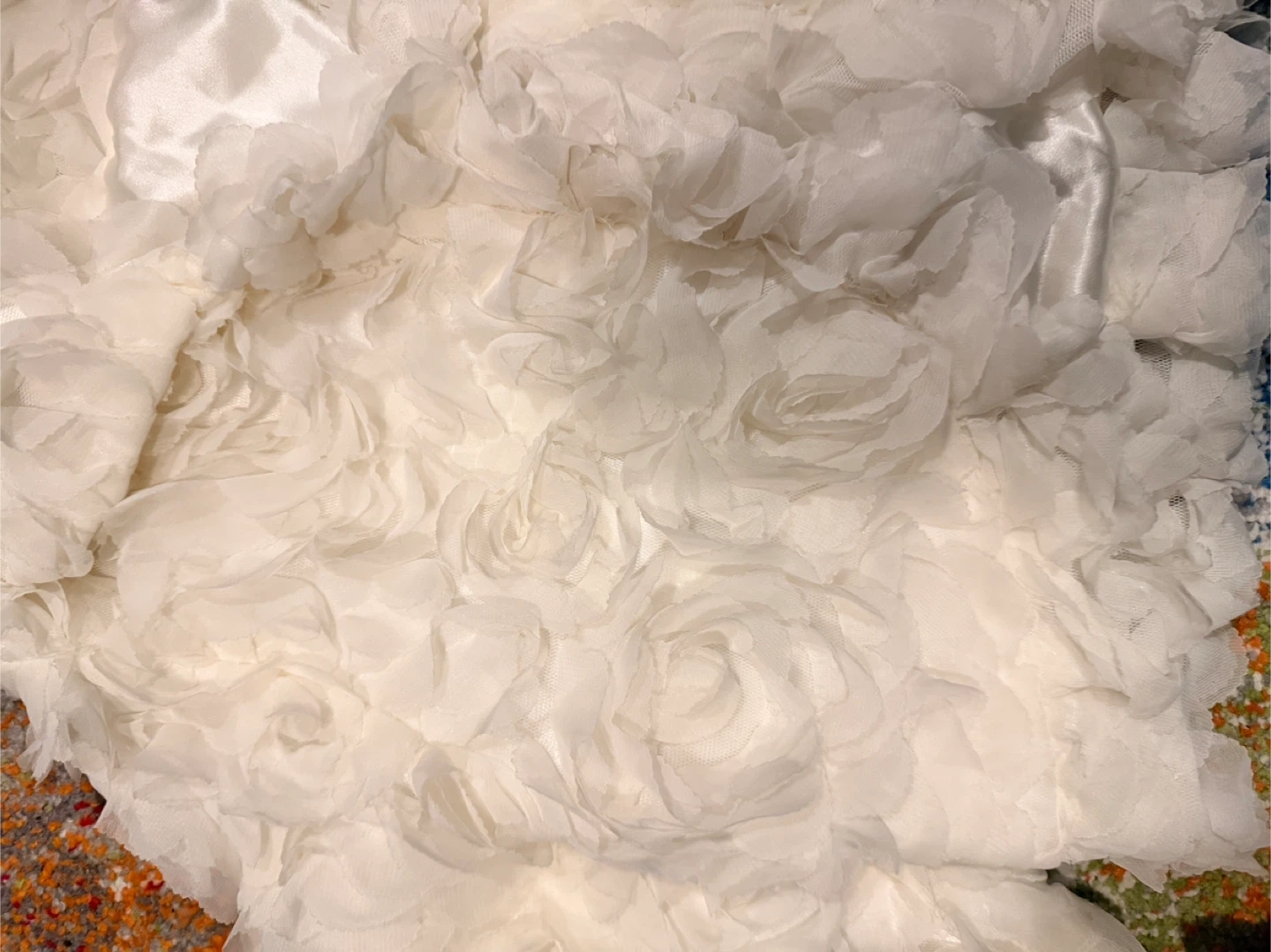 It is lovely for sure. This elegant white bolero jacket is adorned with delicate faux roses all over.