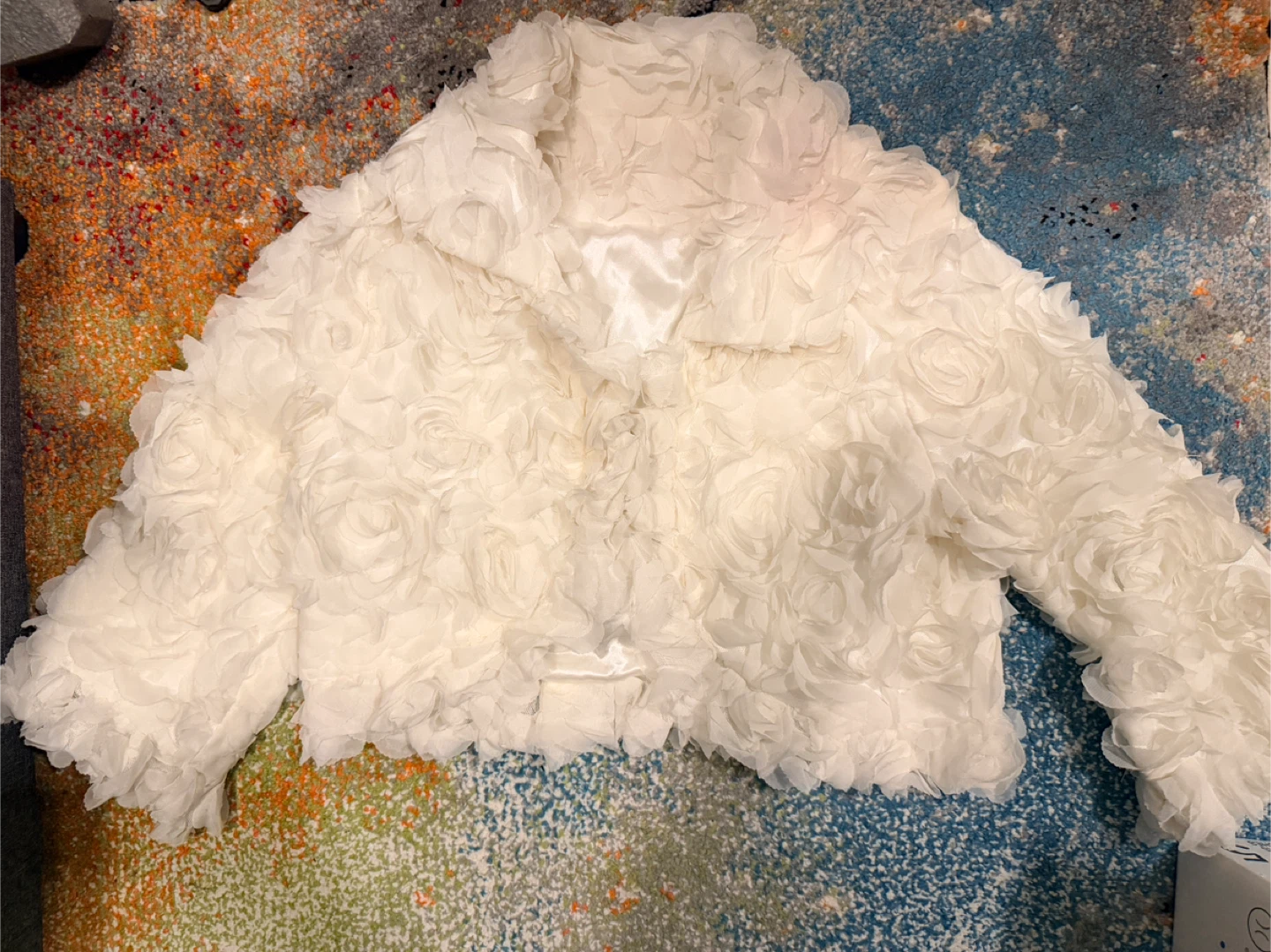 It is lovely for sure. This elegant white bolero jacket is adorned with delicate faux roses all over.
