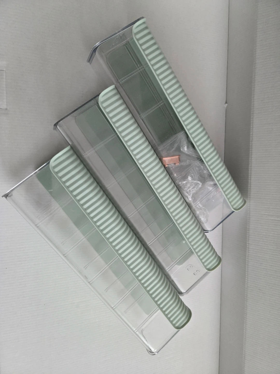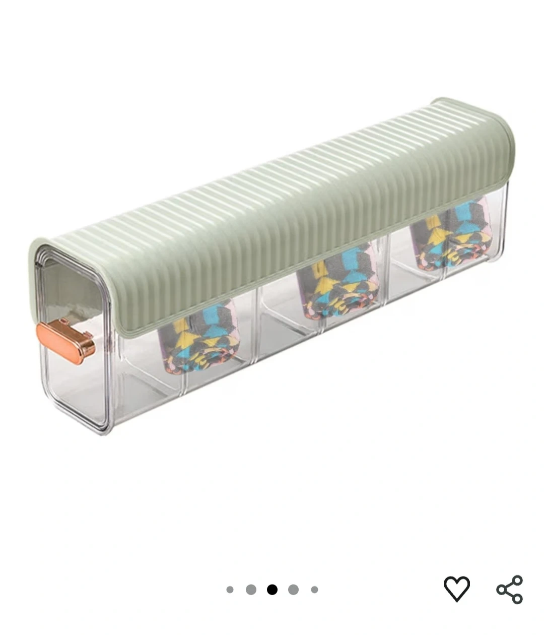 This is a clear storage organizer box with a light green lid and a rose gold handle. It has four individual compartments, perfect for organizing small items like socks, ties, or cables. The compact design makes it suitable for drawers or shelves. It's great for keeping your space tidy!
