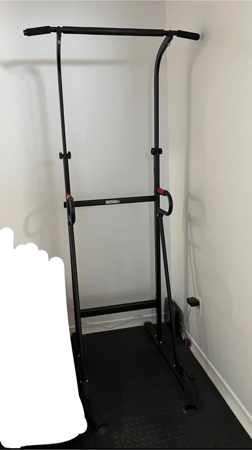 This ONETWOFIT pull-up station is great for home workouts. It's built with a sturdy metal frame. This unit is designed for pull-ups, pushups, and dips. In an excellent condition!