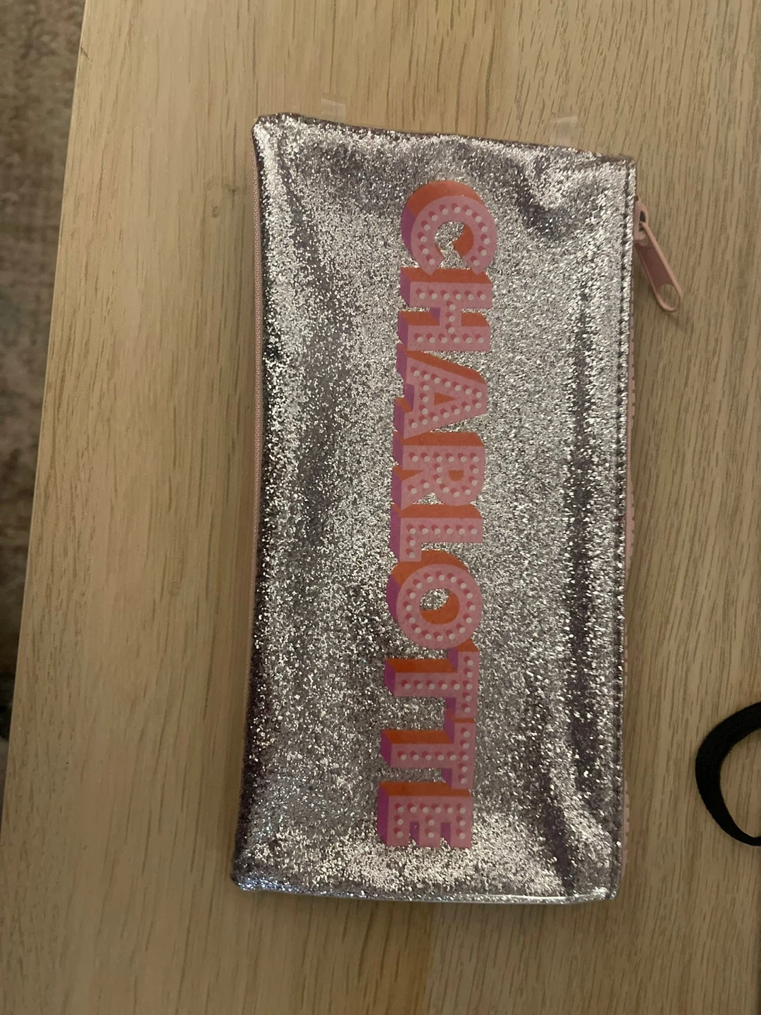 Here's a cute silver glitter pouch with the name 'Charlotte' on it. It's perfect for carrying small items like makeup or accessories. The pouch has a zipper closure to keep your belongings secure