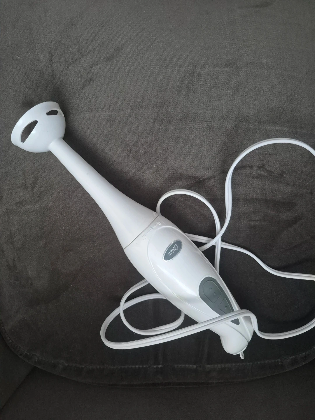 White Oster immersion blender with a cord. It's a handy kitchen tool. Suitable for blending small batches of soups or sauces.