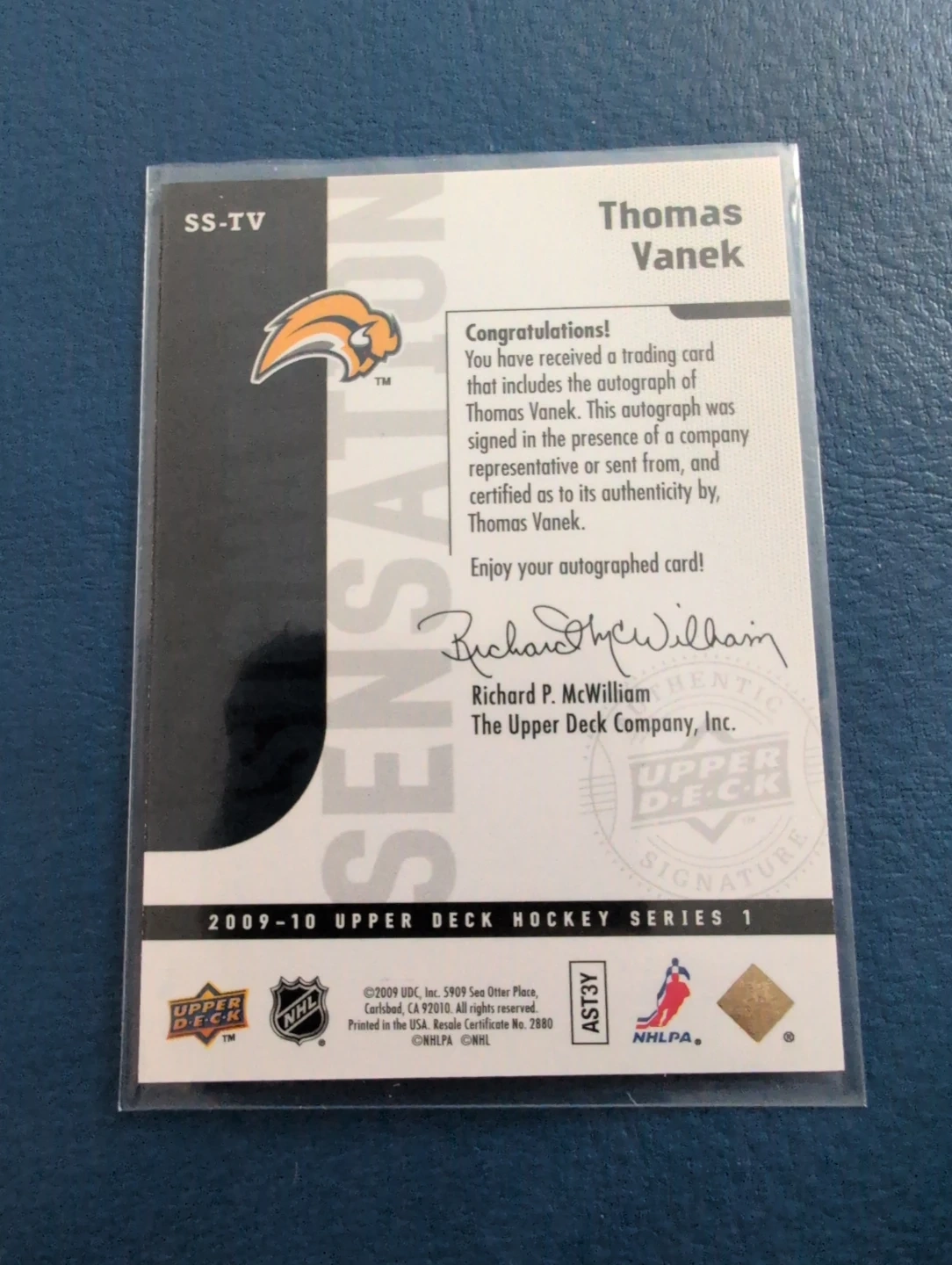 This autograph was signed in the presence of a company representative or sent from, and certified as to its authenticity by, Thomas Vanek. It's from the 2009-10 Upper Deck Hockey Series 1 set.
