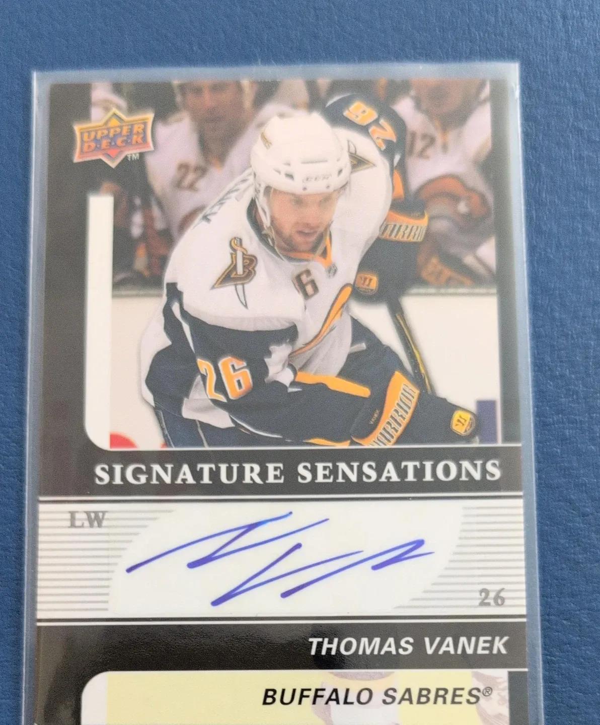 This autograph was signed in the presence of a company representative or sent from, and certified as to its authenticity by, Thomas Vanek. It's from the 2009-10 Upper Deck Hockey Series 1 set.