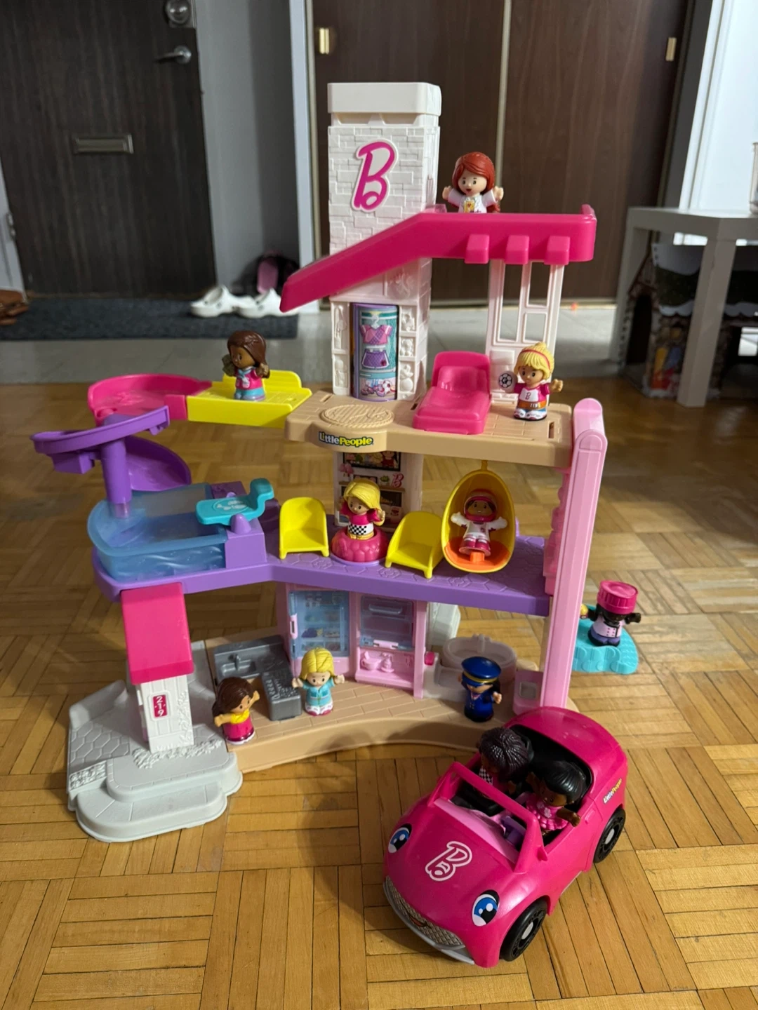 Fisher-Price Little People Barbie Dreamhouse playset with accessories and figures.