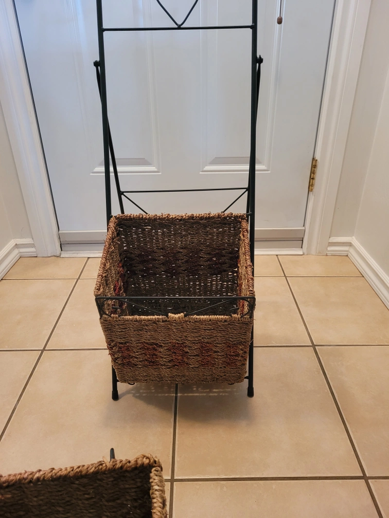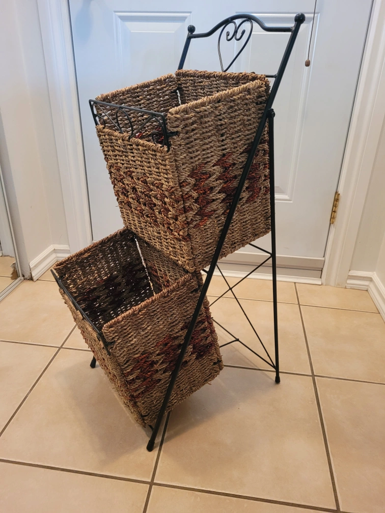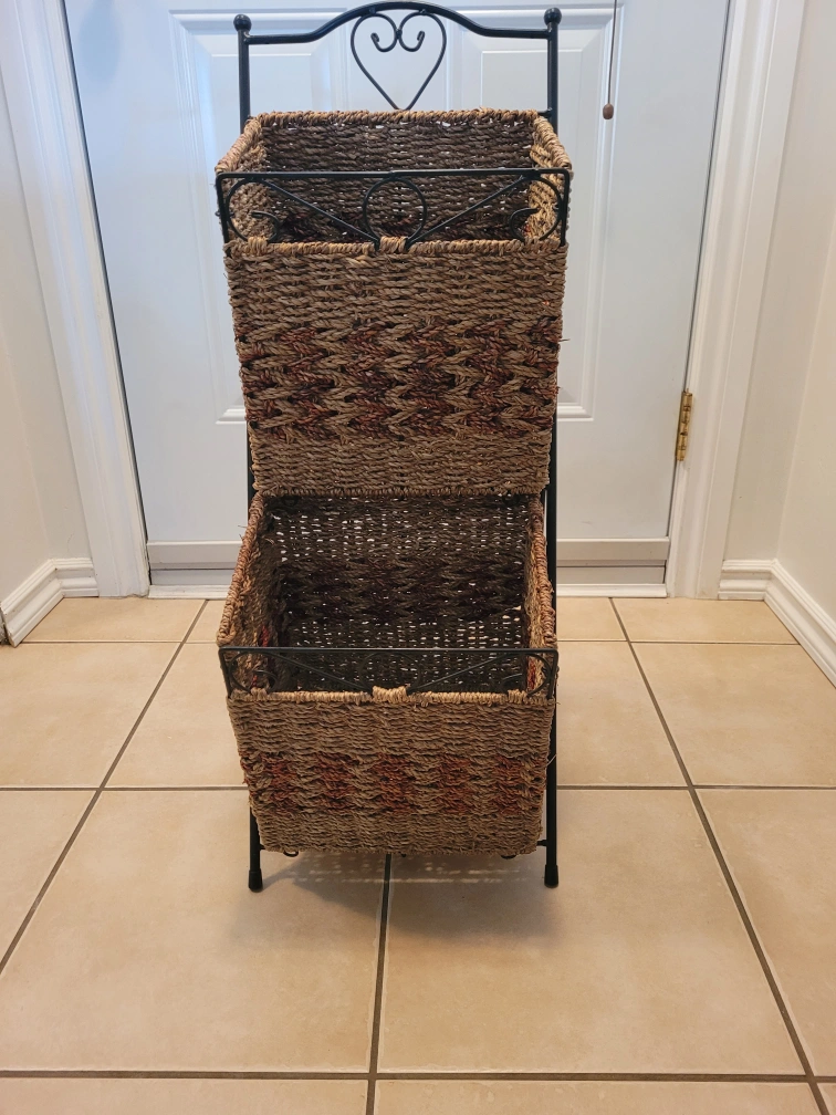 Two-tier wicker basket stand in good condition! Perfect for organizing items in any room, from mail to magazines to produce. The stand has a black metal frame and two woven wicker baskets. It's a stylish and functional piece for your home