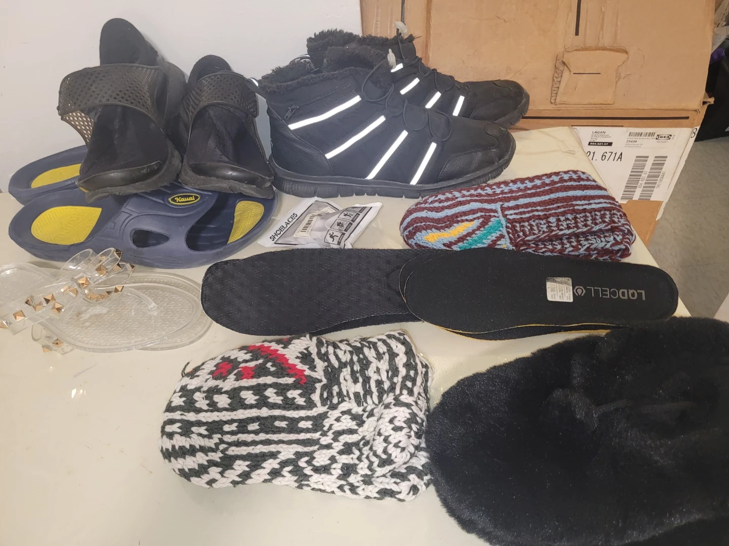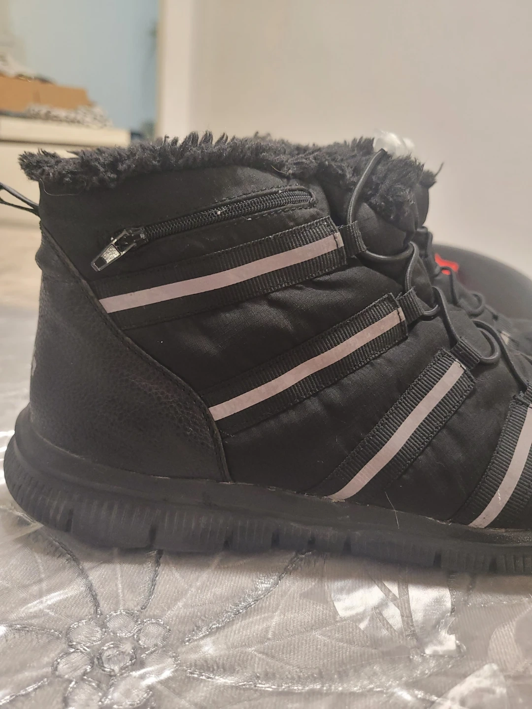 These black winter boots are designed for warmth with a fuzzy lining. They feature reflective stripes for added visibility. Elastic laces with a toggle allow for a secure fit. These boots are great for staying warm and seen during colder months!