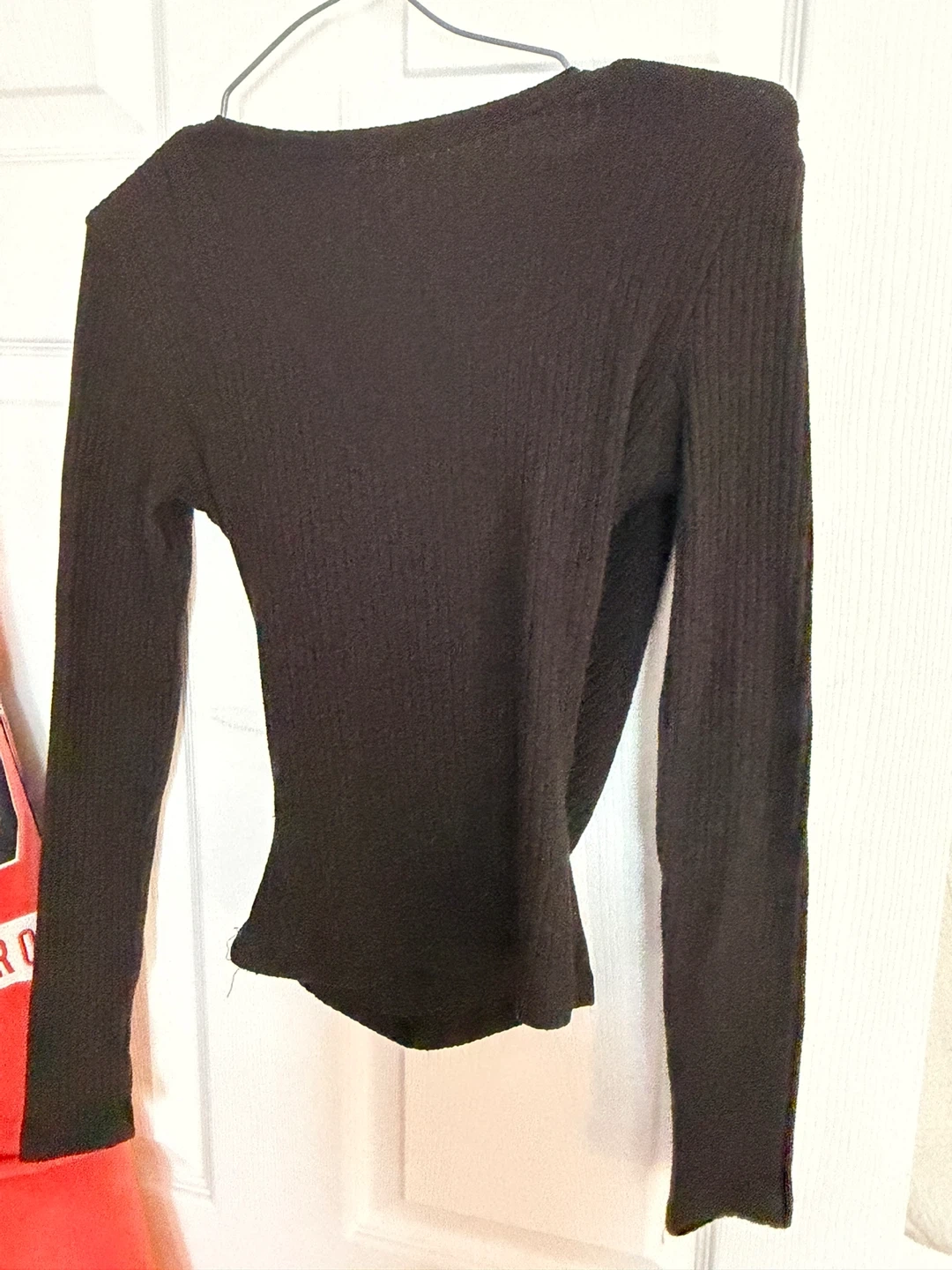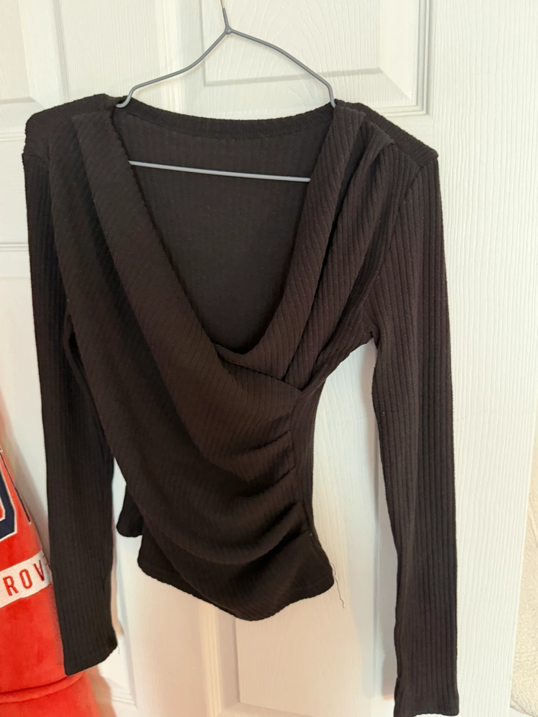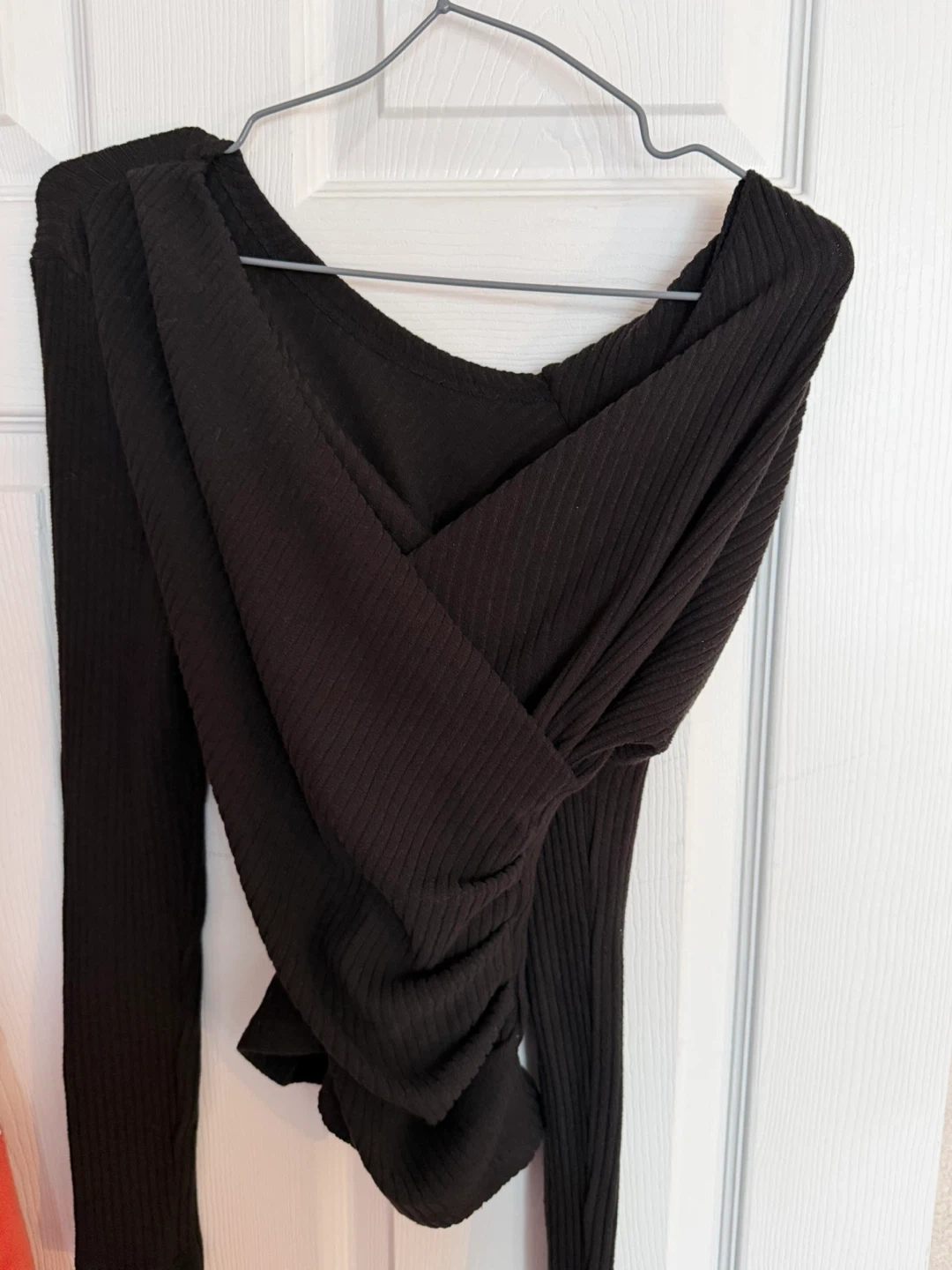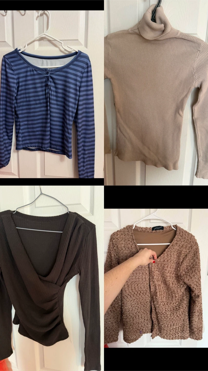 This lot includes four women's long sleeve tops. Features include various necklines and ribbed textures. Materials vary by top.