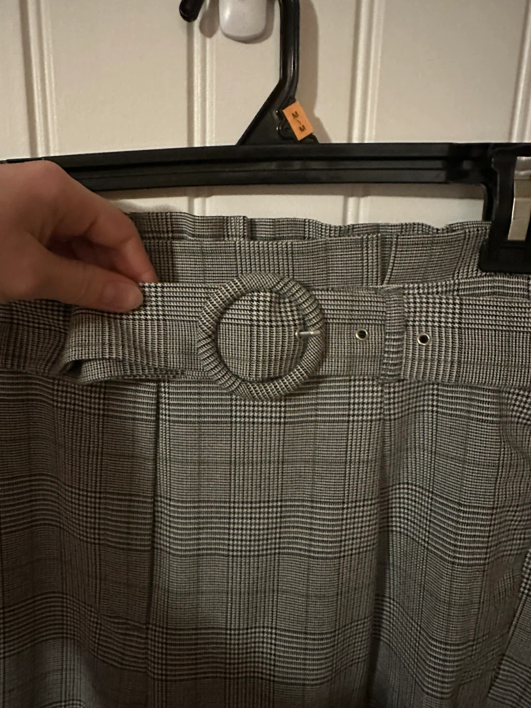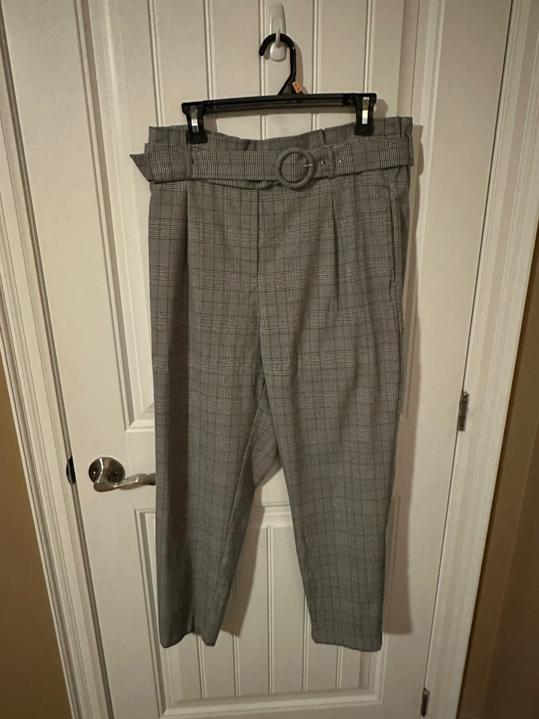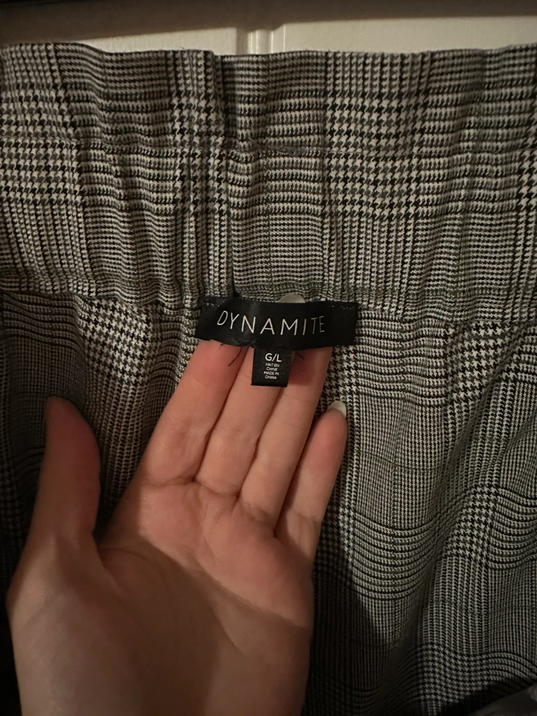 These Dynamite pants feature a classic plaid pattern with a paperbag waist and a matching belt. They're a size G/L. Their stylish design makes them suitable for both casual outings and more dressed-up occasions.
