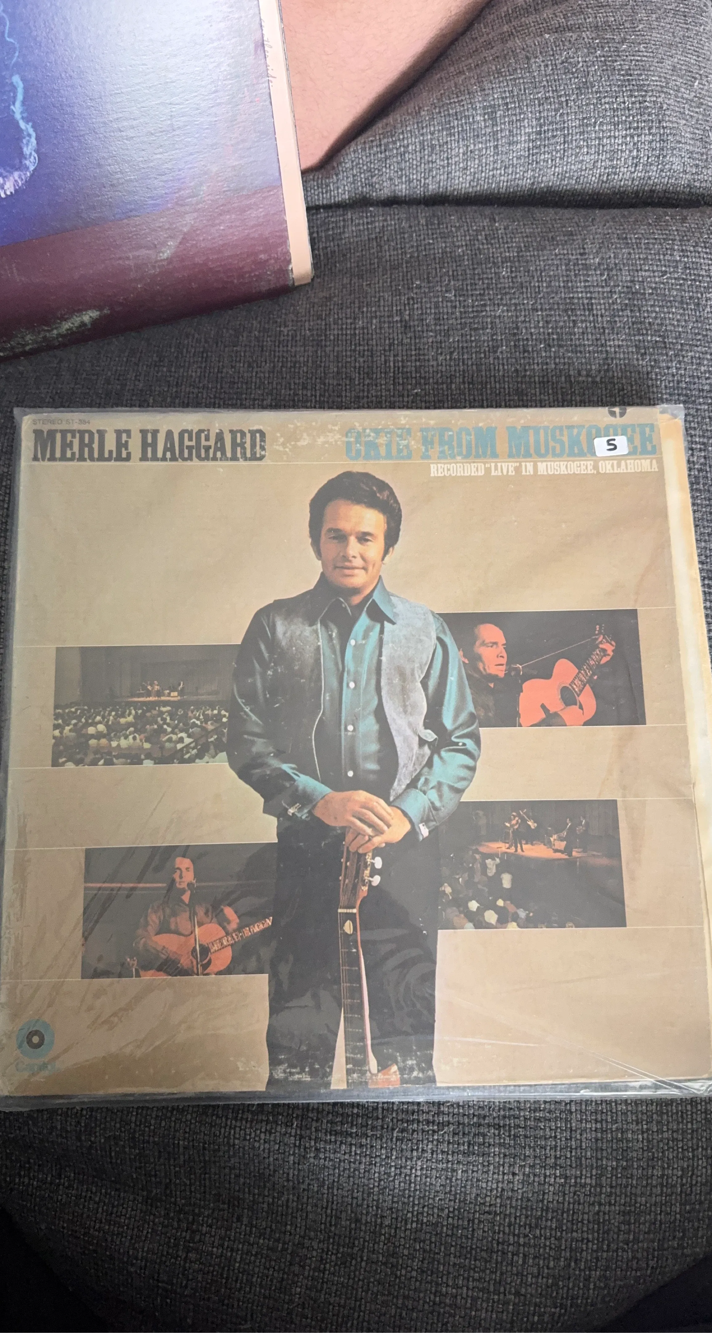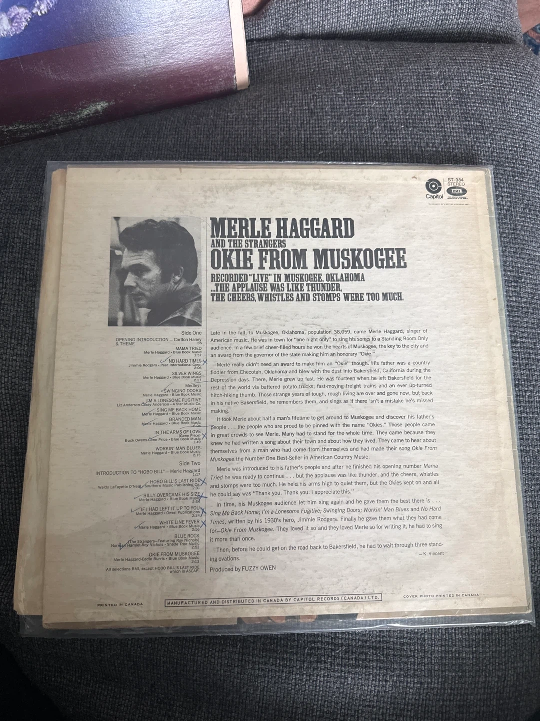 This is the Merle Haggard & The Strangers vinyl record, 'Okie from Muskogee'. Recorded live in Muskogee, Oklahoma. It features songs like 'Okie From Muskogee' and 'Mama Tried'. Album was a number one best-seller in American Country Music.