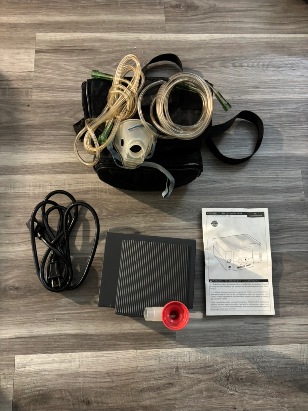 Items for medical purposes. Includes a carrying bag and a variety of accessories. The compressor is useful for providing necessary treatments that can help alleviate breathing issues.