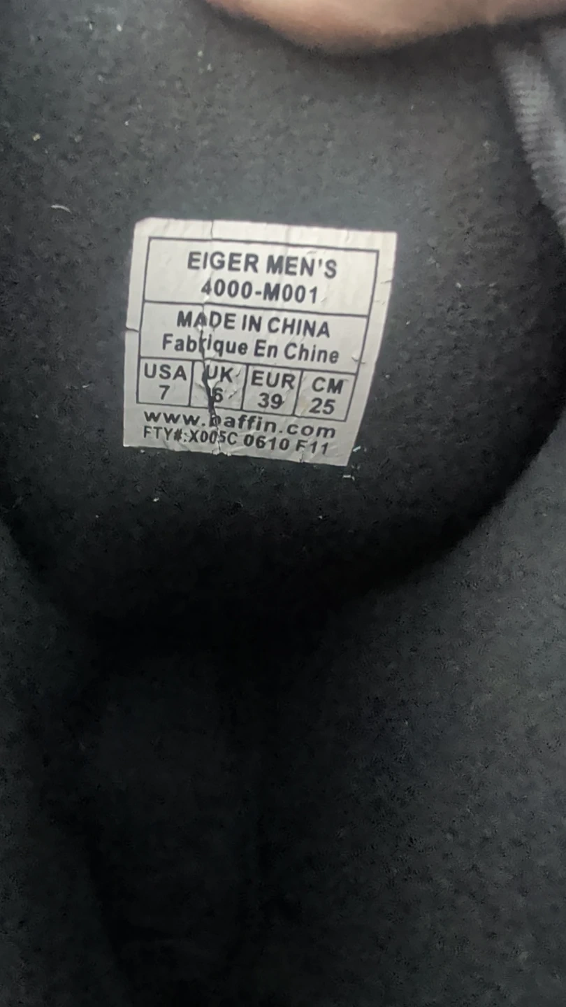 These Baffin Eiger winter boots are made for men. They're black and feature a durable rubber sole with adjustable straps. Includes original liner. Size 7 USA.