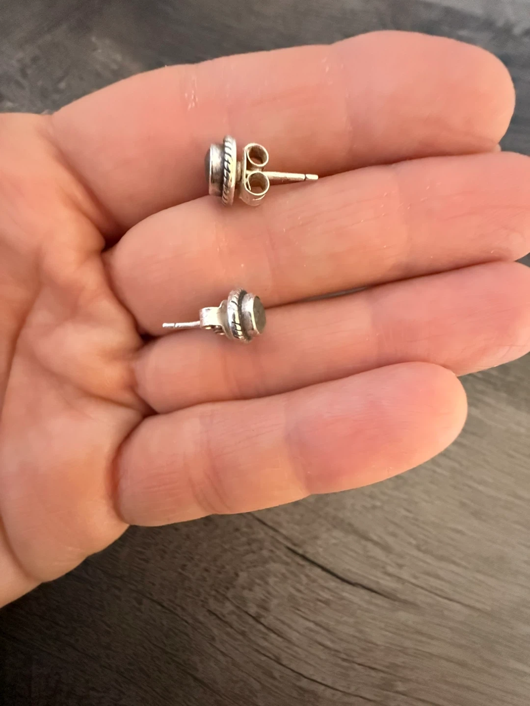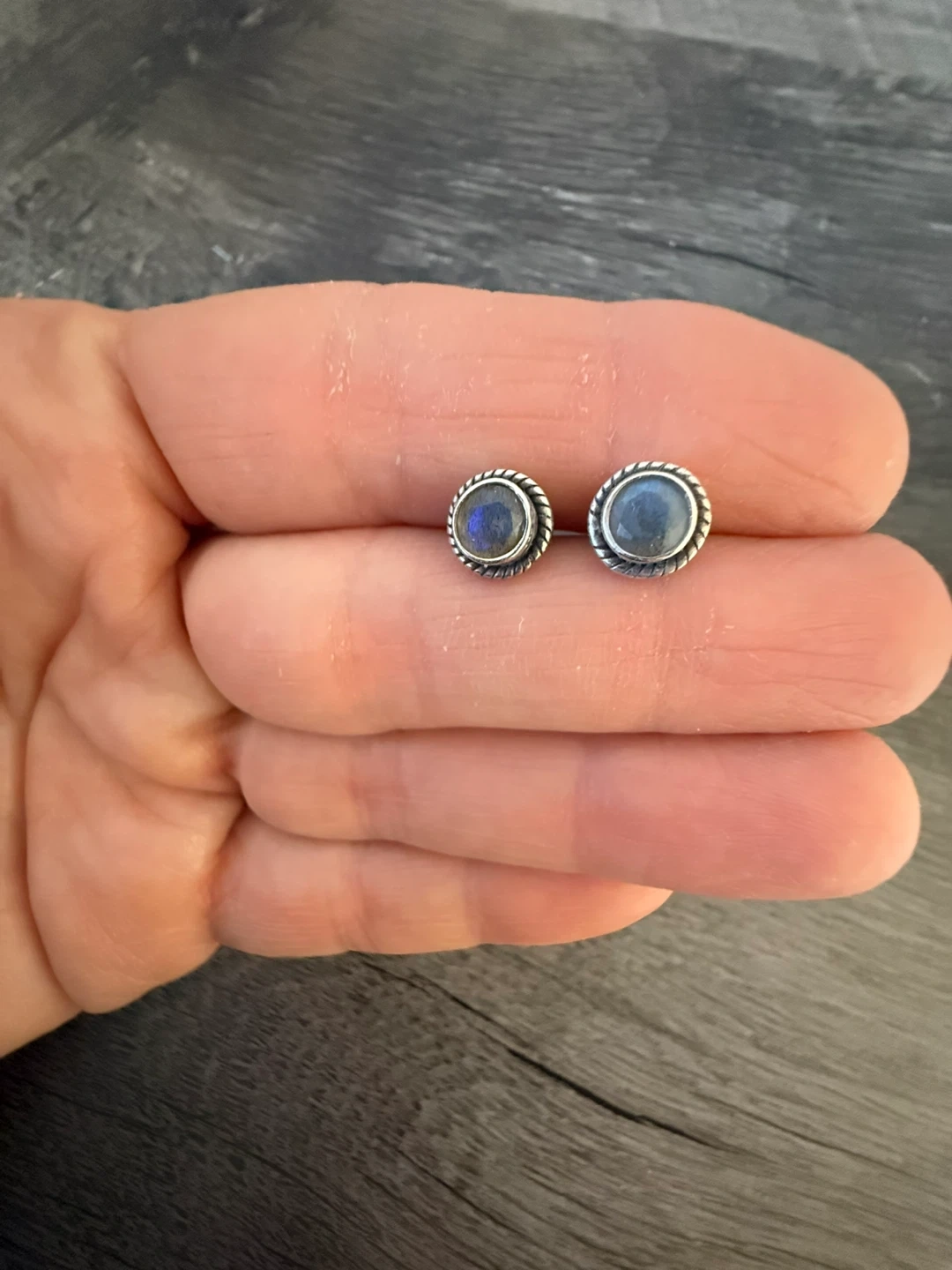 These are sterling silver Labradorite stud earrings with a textured rope edge. They feature round, polished gemstones with a unique iridescent blue and grey shimmer. Perfect for everyday wear or dressing up an outfit!