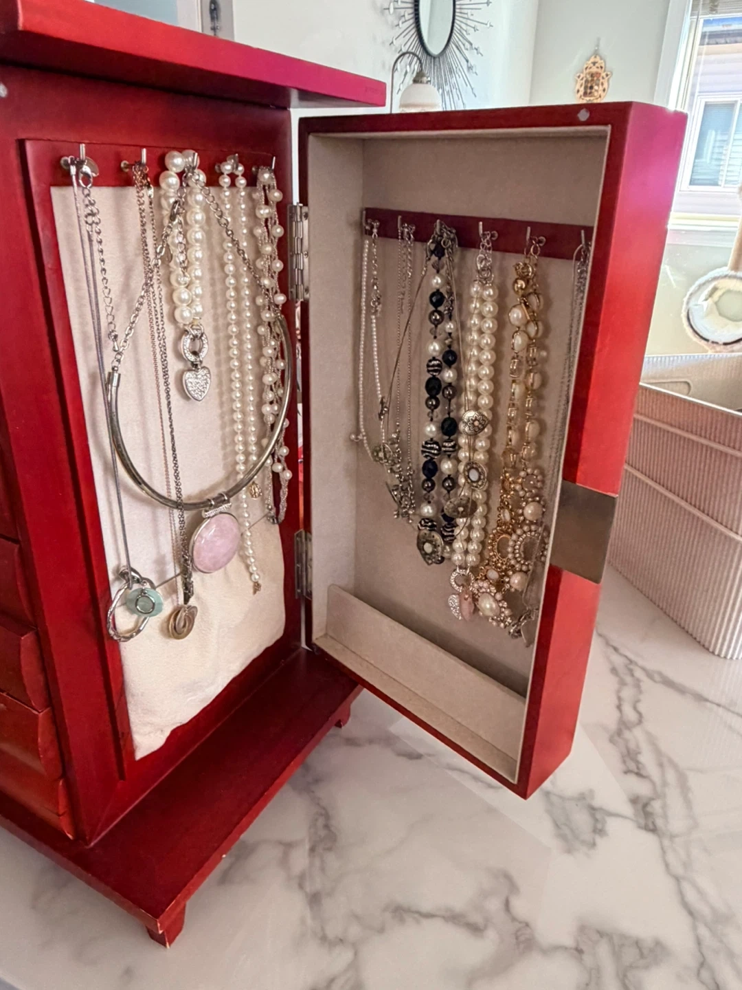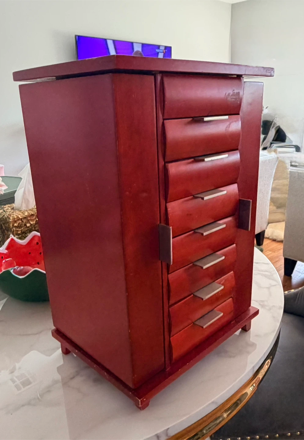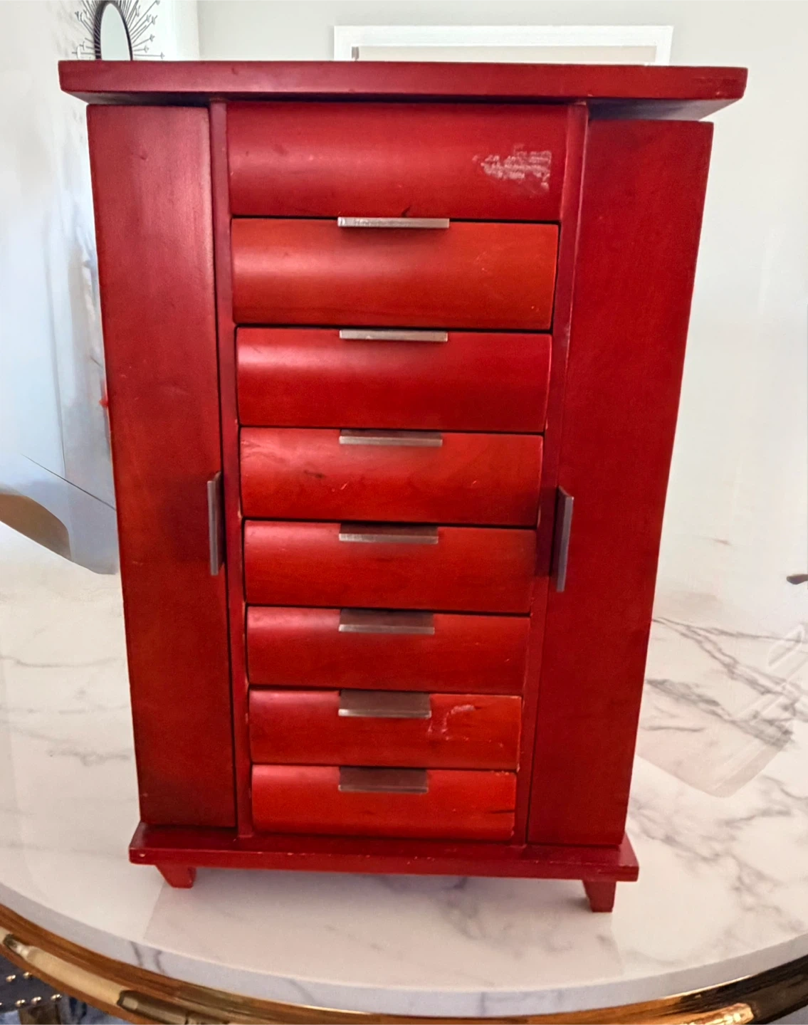 Red wooden jewelry box featuring seven drawers for storage and organization. It has a hinged door that opens to reveal necklace hooks and additional compartments. This box is perfect for keeping your jewelry collection tidy and accessible!