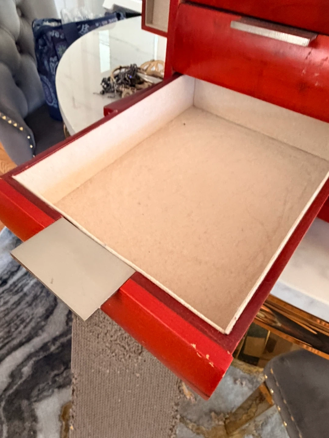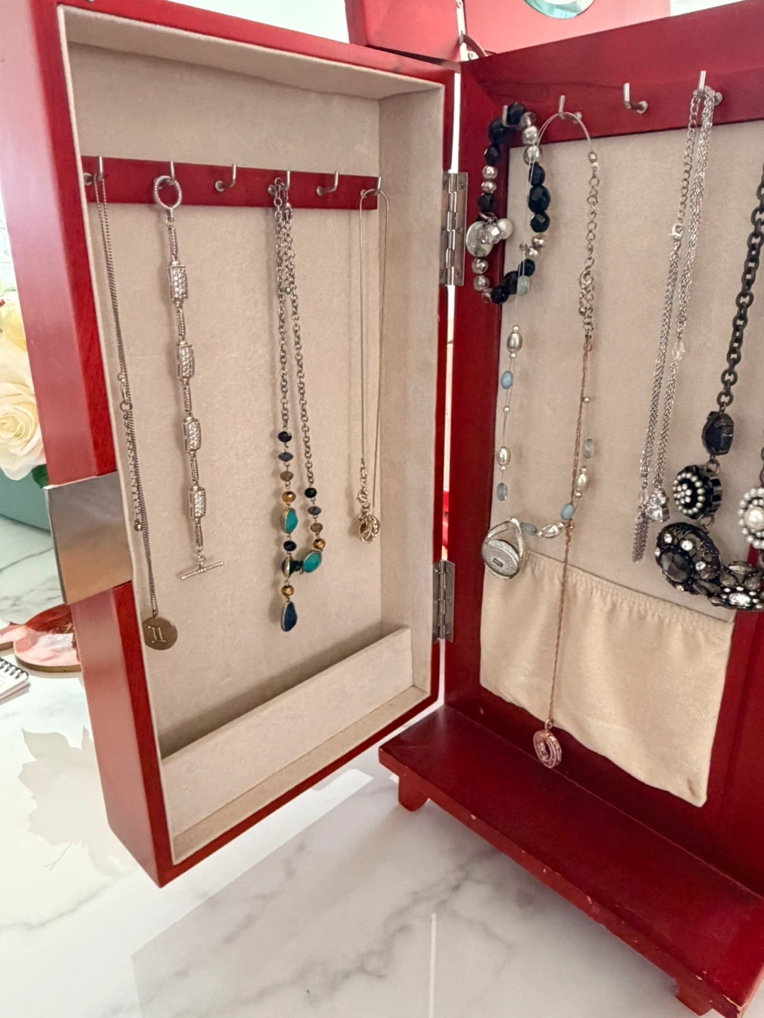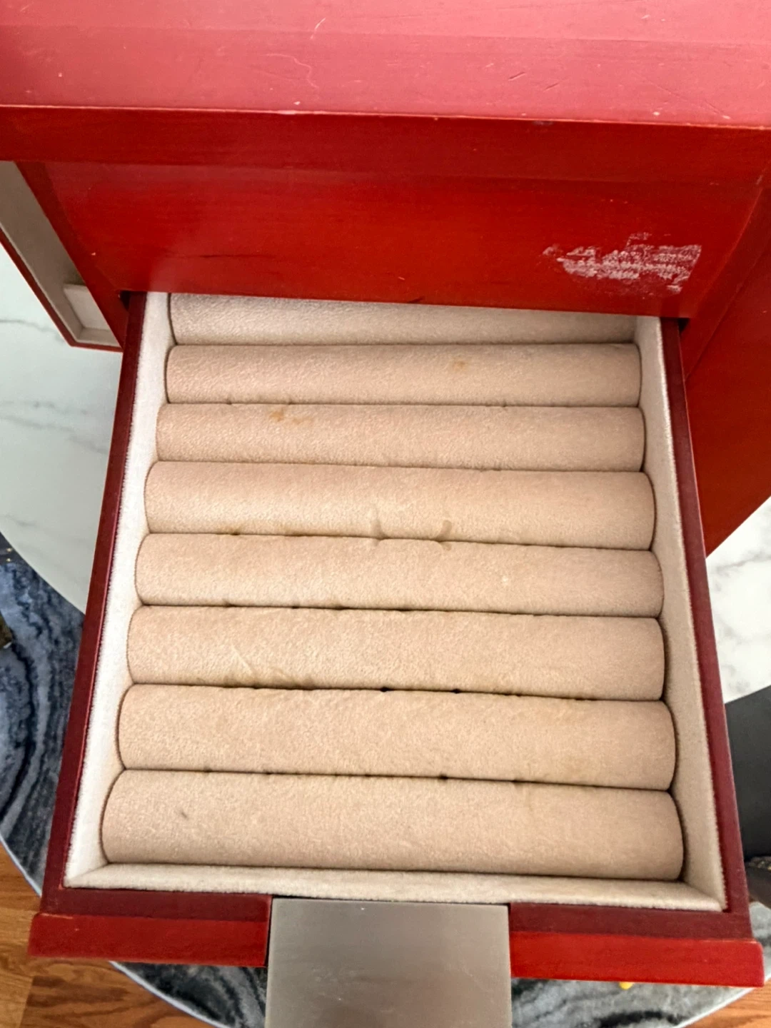 Red wooden jewelry box featuring seven drawers for storage and organization. It has a hinged door that opens to reveal necklace hooks and additional compartments. This box is perfect for keeping your jewelry collection tidy and accessible!
