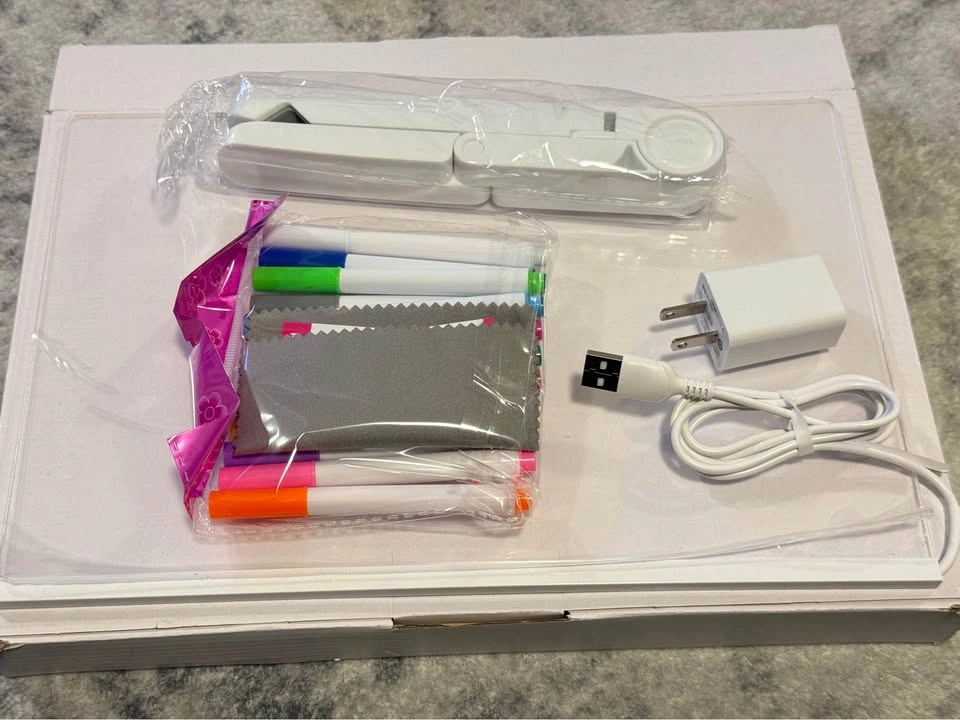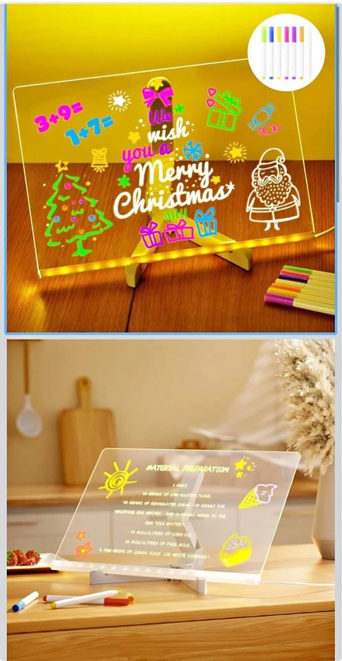 Versatile LED writing board set. Includes the light-up acrylic board, a stand, and colorful markers. Also has a cleaning cloth, USB cable, and wall adapter. Great for leaving notes, drawing, or displaying recipes. Can use for different events like birthdays or holidays. Brand is MOUNTCLIM. This quality retails for $35-50. New in box. Pick up from Renforth and Eglinton or downtown Union Station.