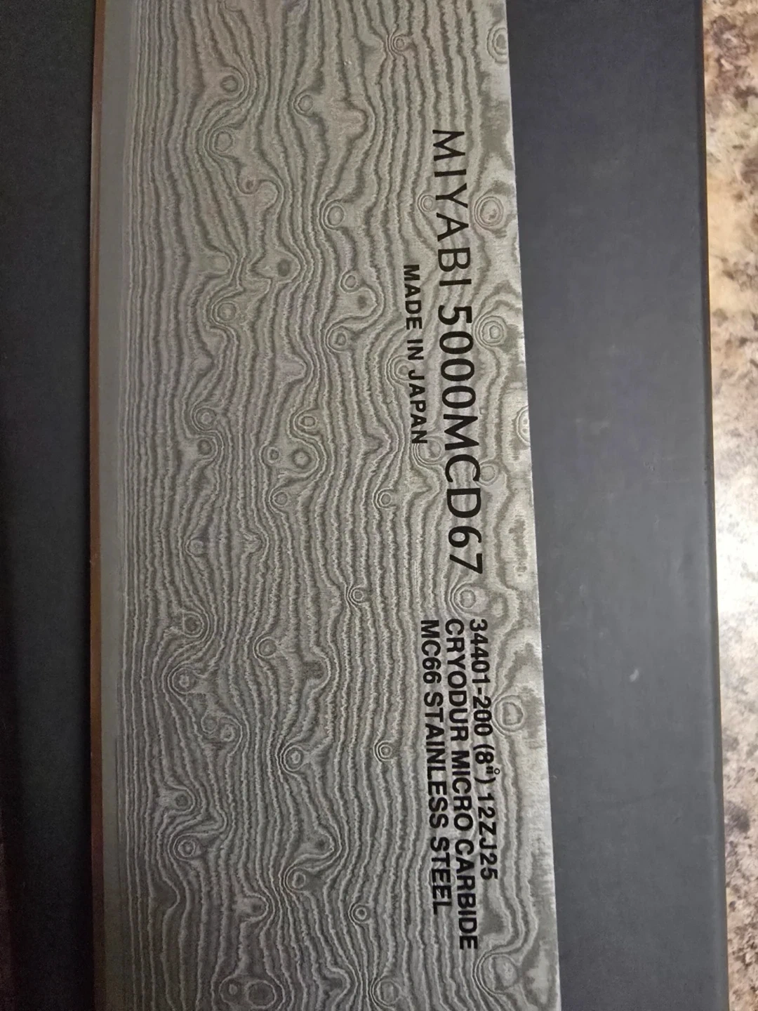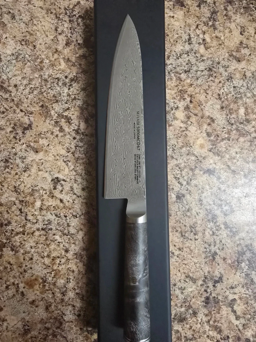 Miyabi Black 5000MCD67 chef's knife with a Damascus pattern. 8-inch blade made of Micro-Carbide steel. Very lightly used. Includes original box.