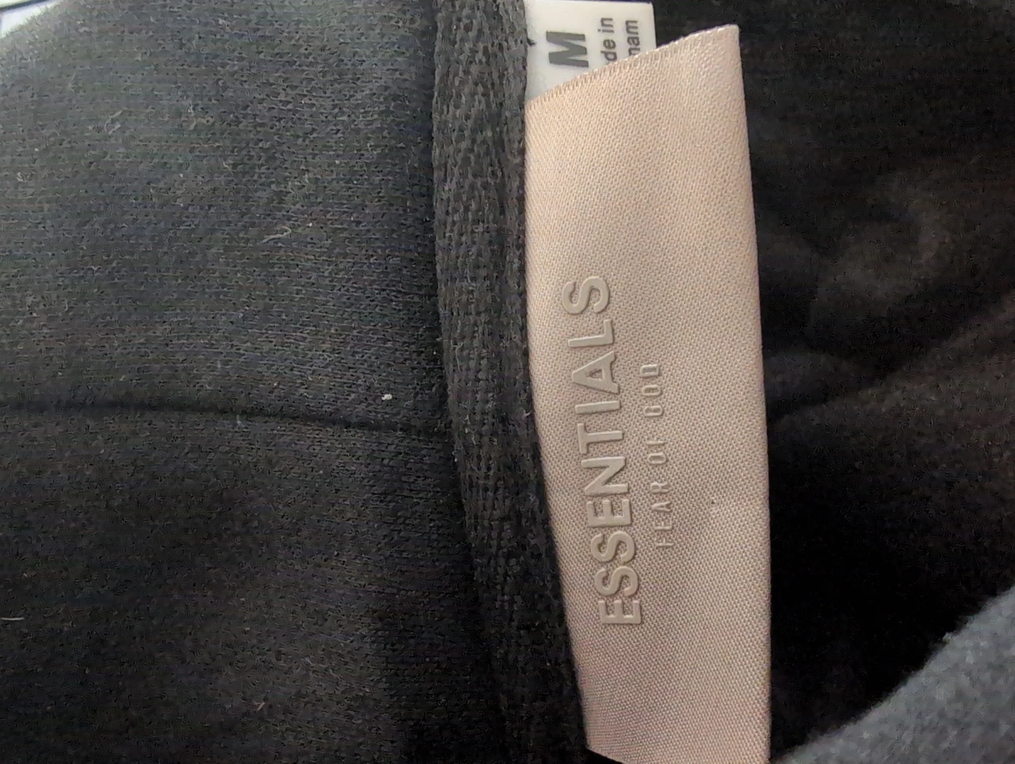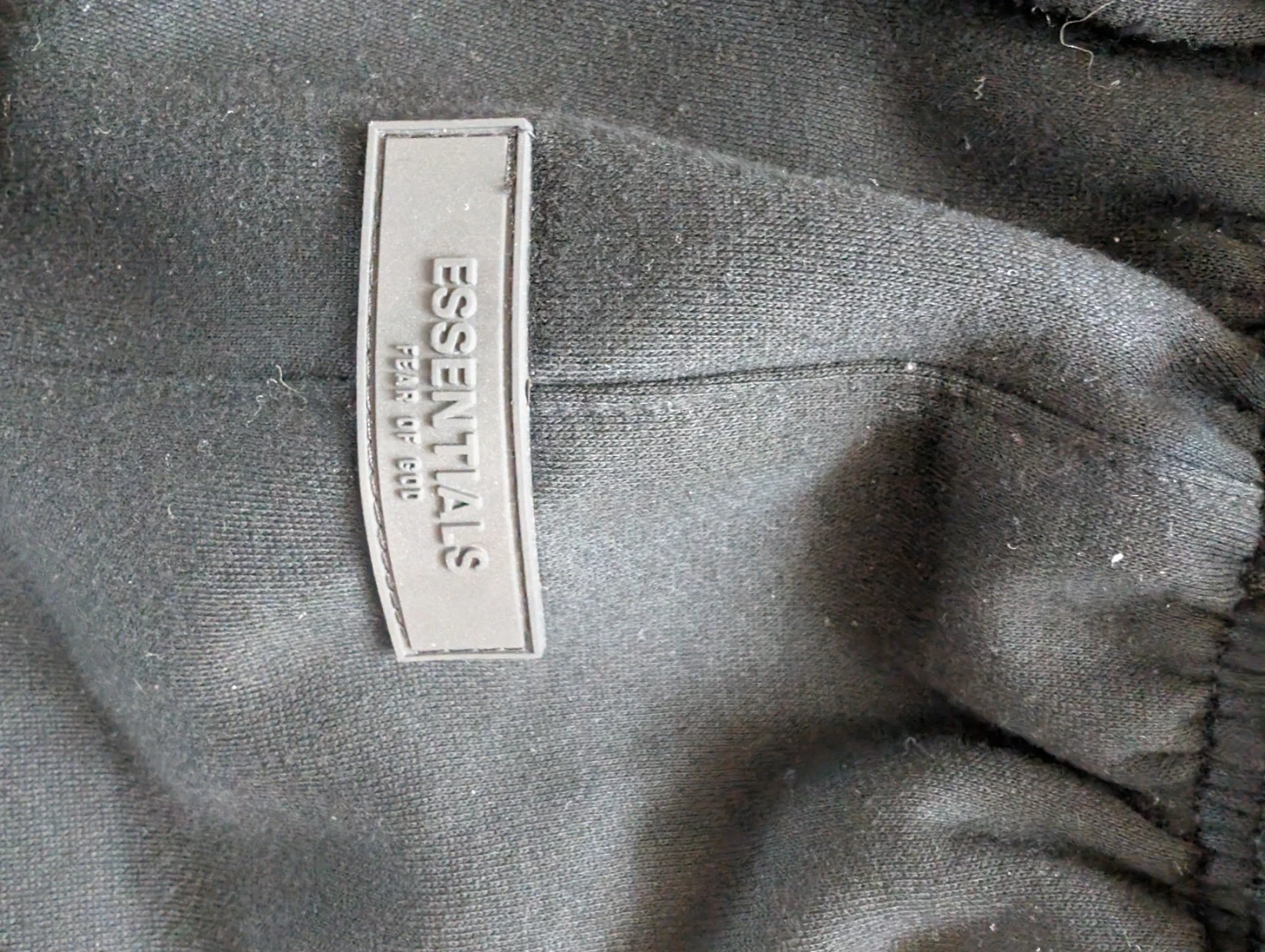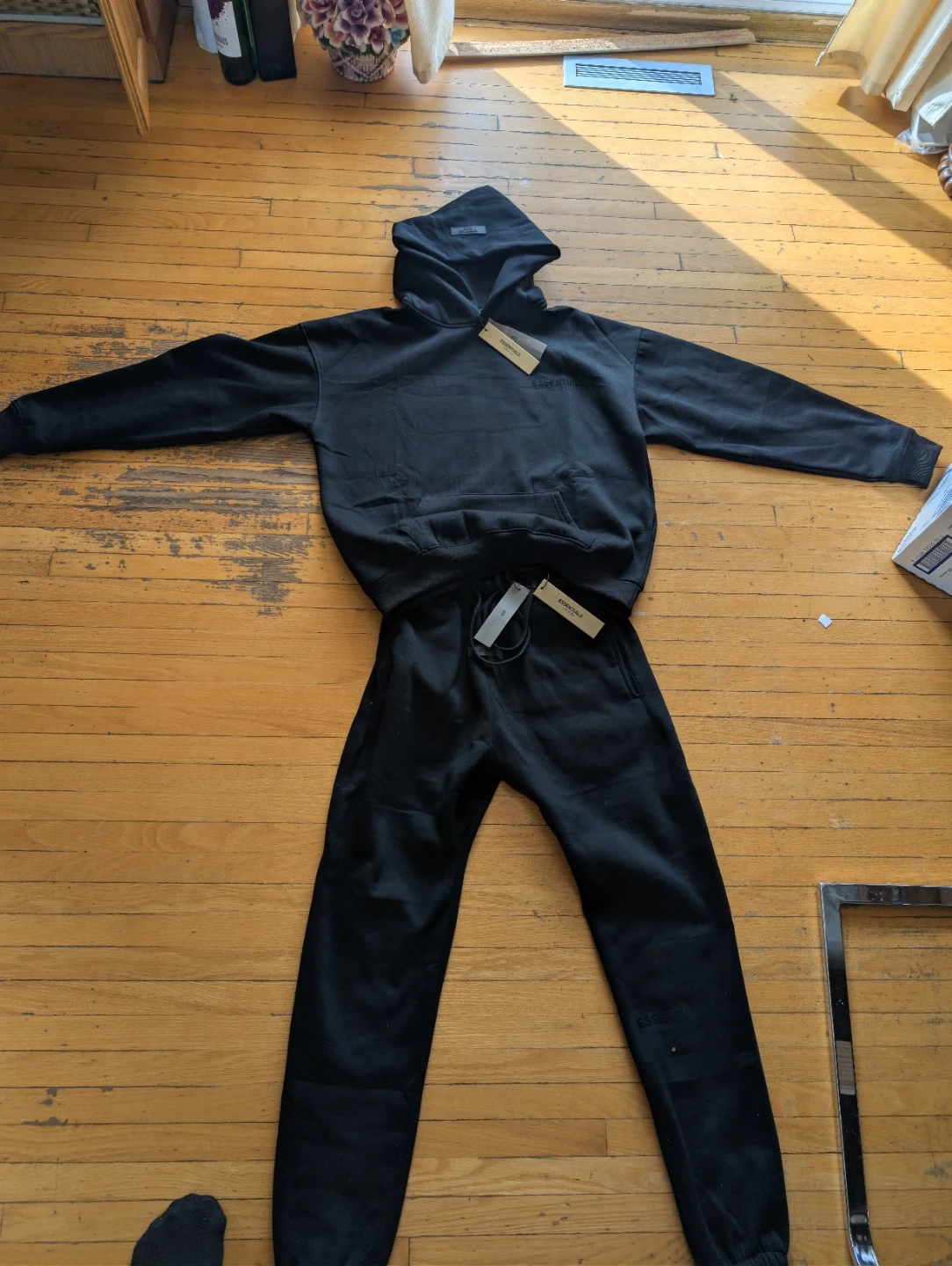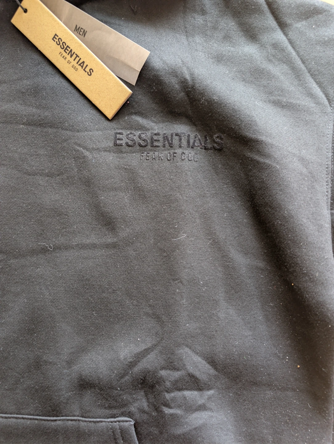 This is a black Fear of God Essentials hoodie and sweatpants set. The set is made from a comfortable fabric. It's perfect for casual wear.