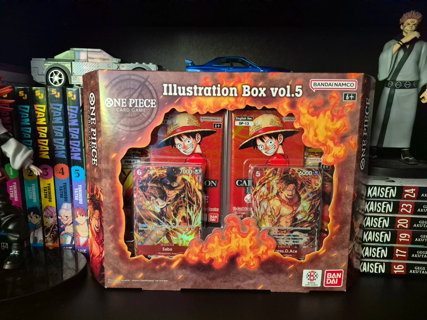This is the One Piece Card Game Illustration Box vol.5. It features 2 English versions of the OP-13 set. The box includes promo cards of characters like Sabo and Portgas D. Ace.