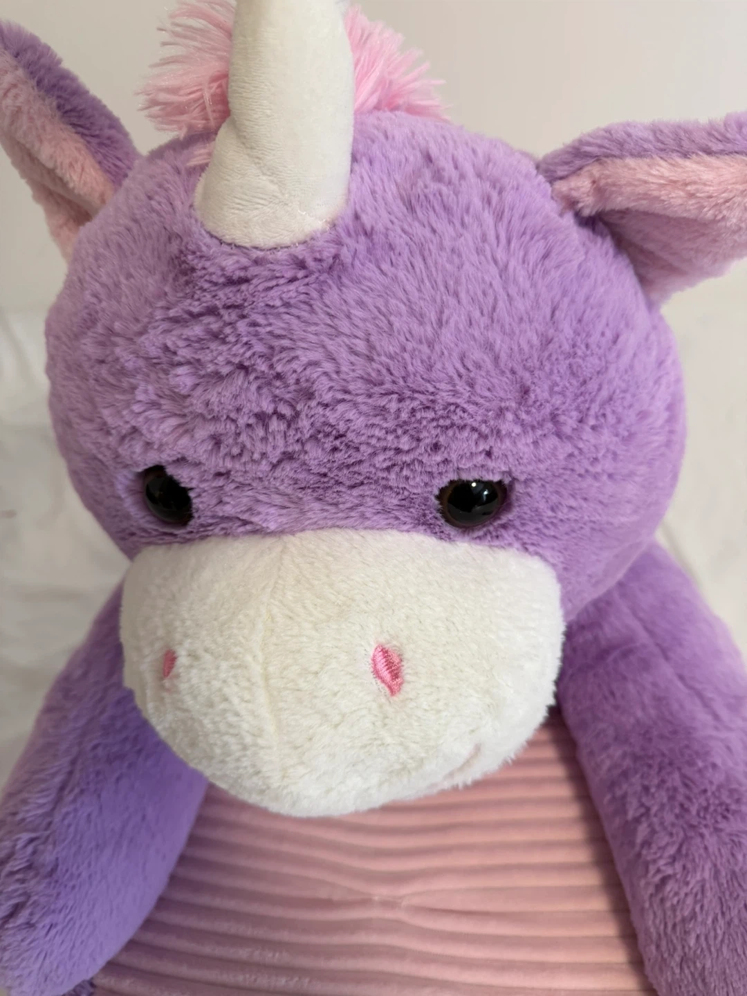 This adorable purple plush unicorn seat is super soft and cuddly! It's perfect for a little one's room. Made with fuzzy polyester material.