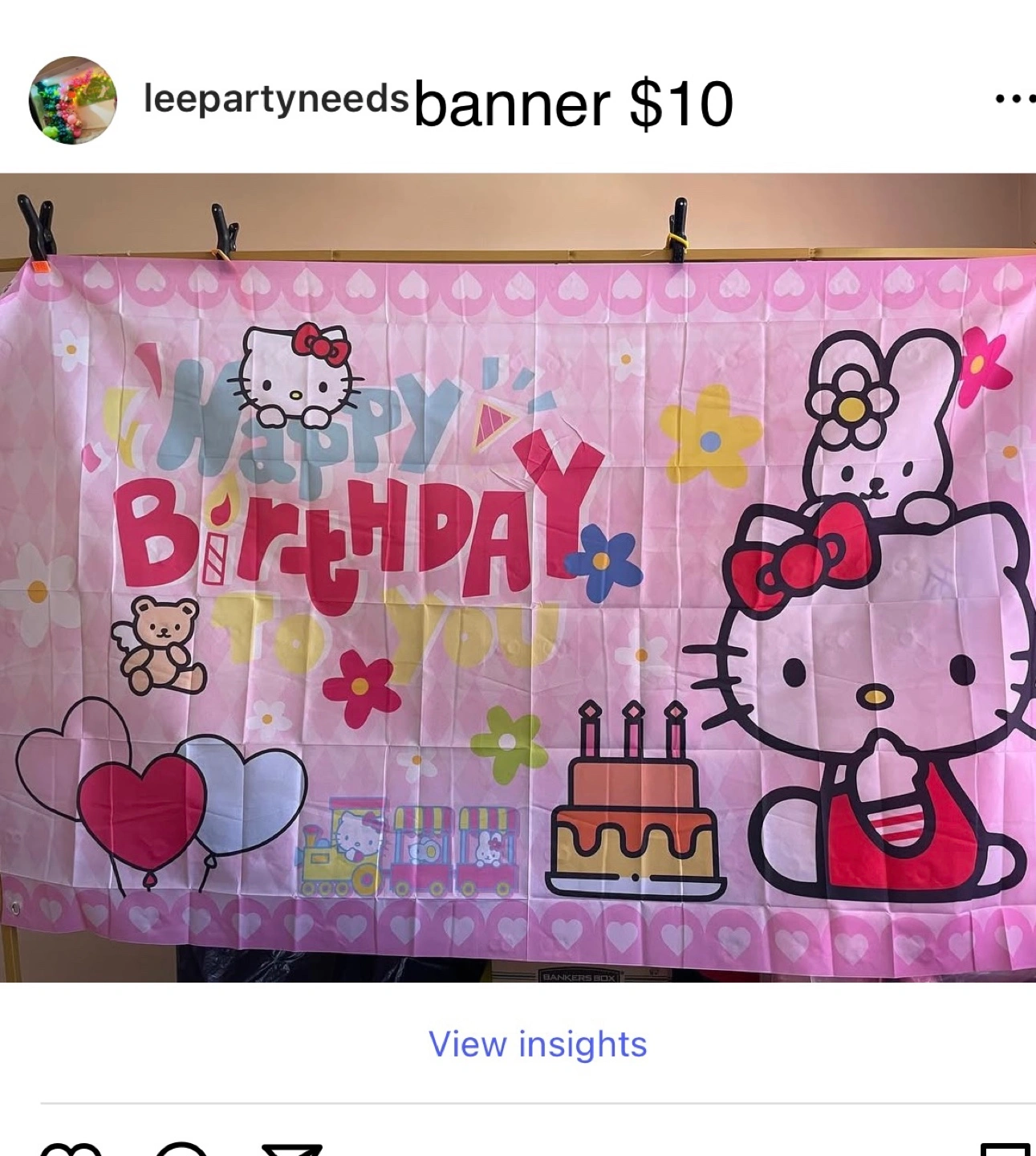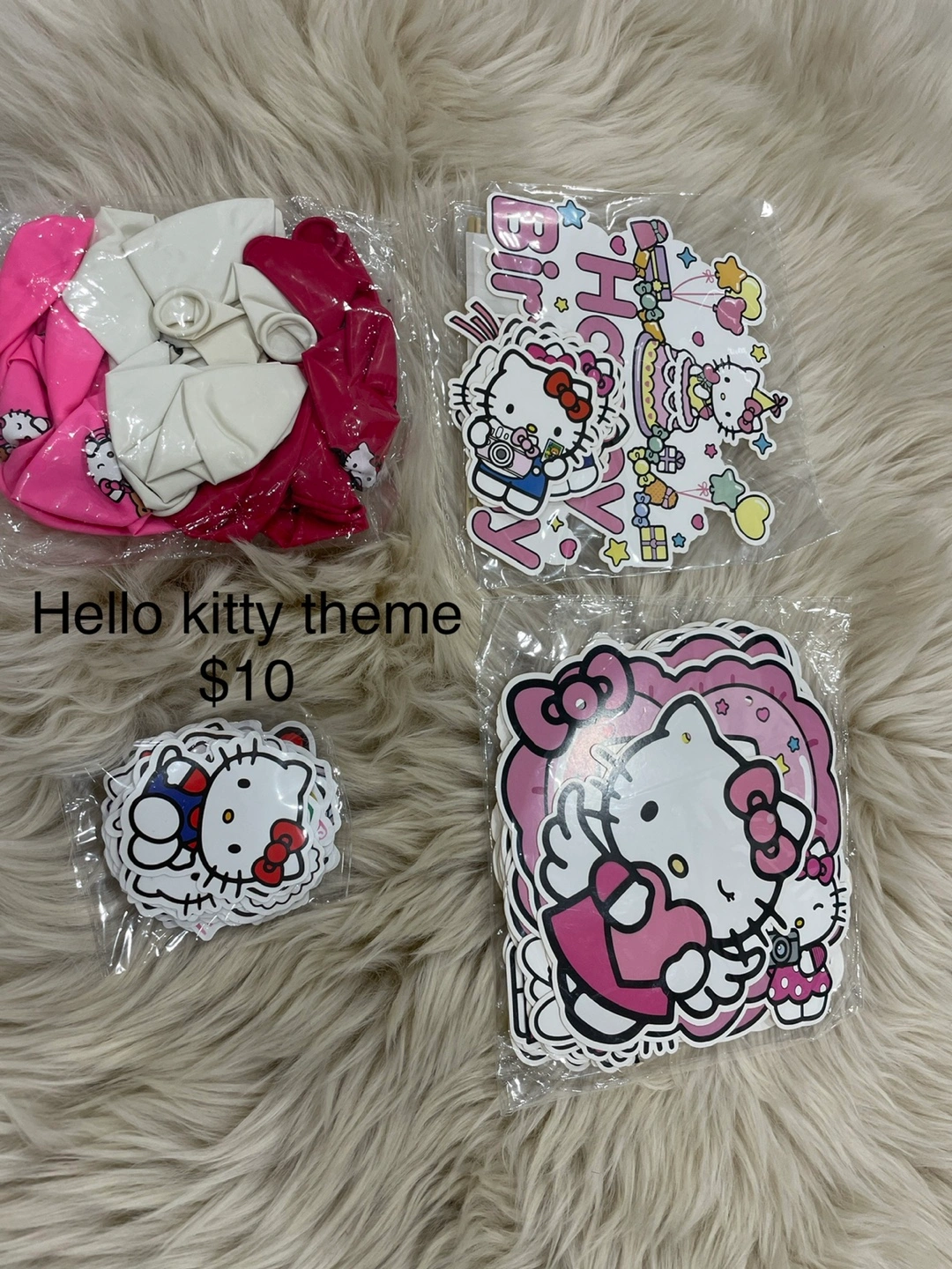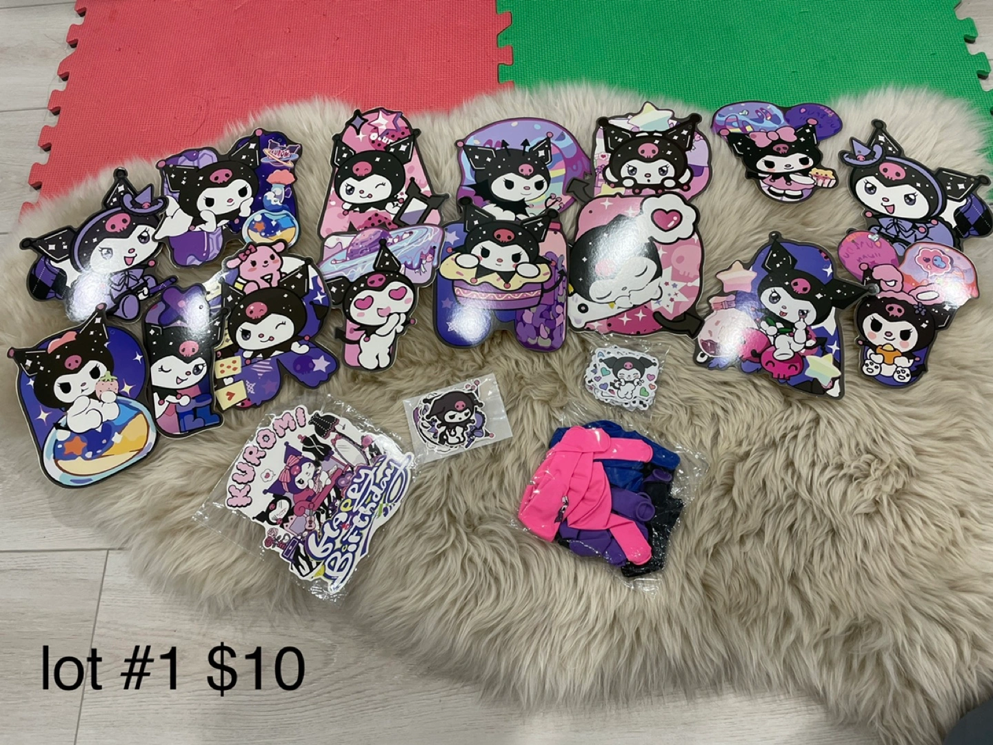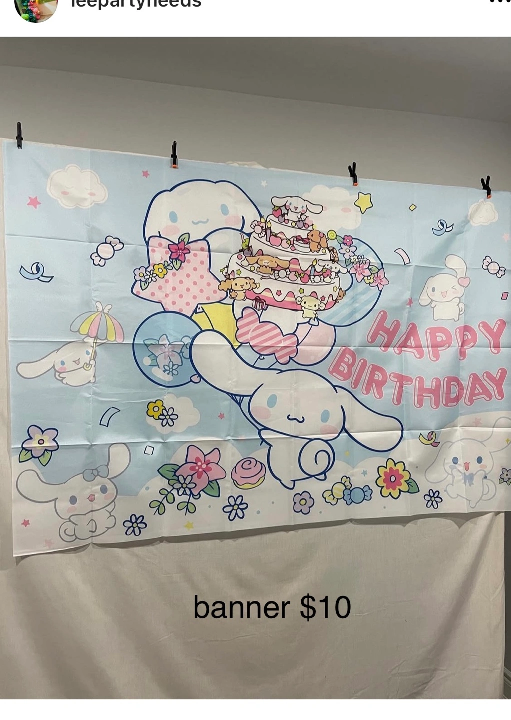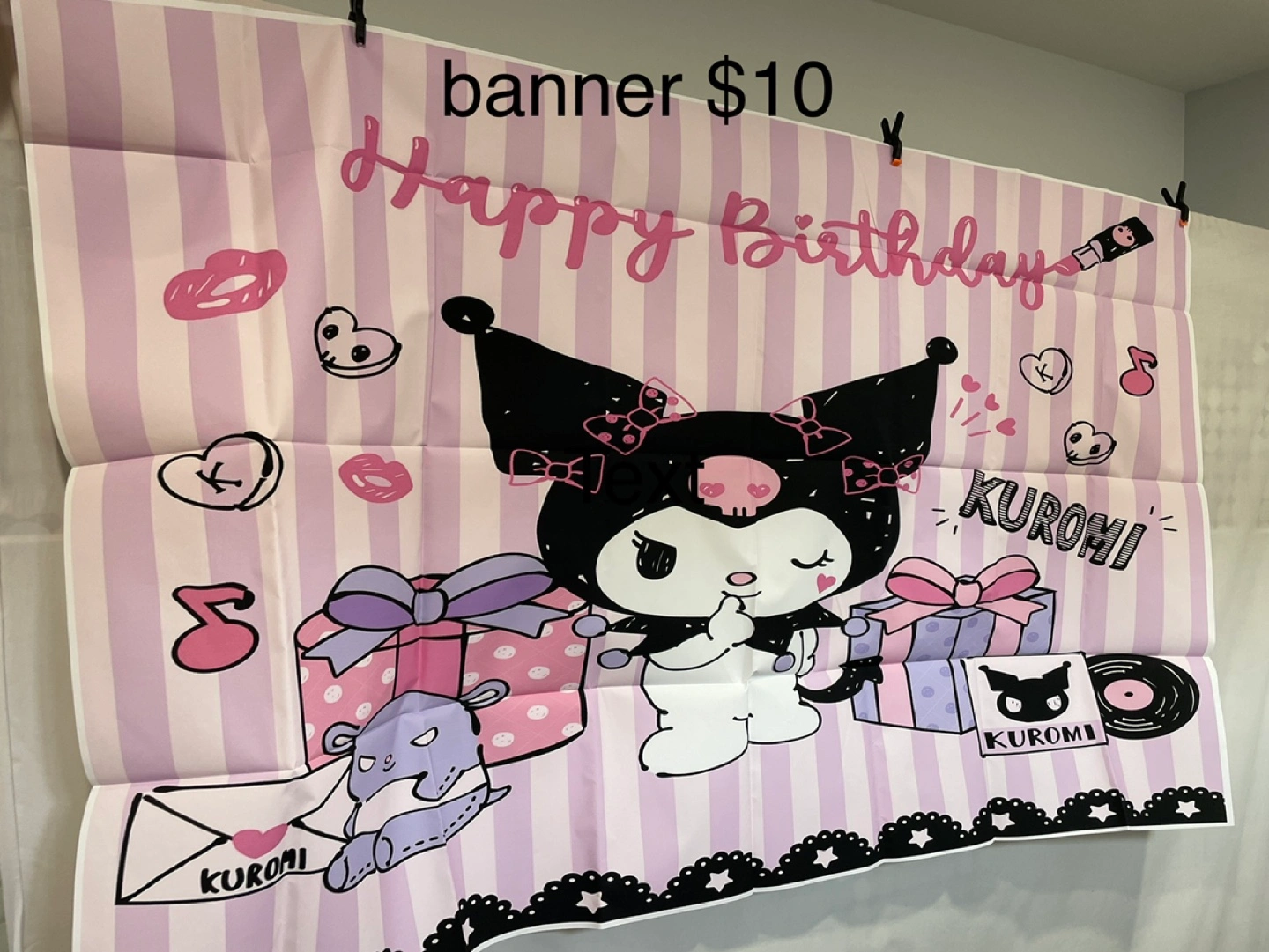 Various Sanrio character themed birthday banners and party supplies. Includes Hello Kitty and Kuromi designs. Banners and decorations available. $10 each.