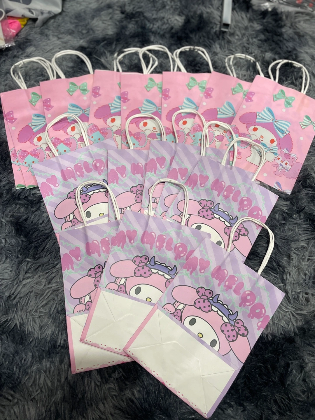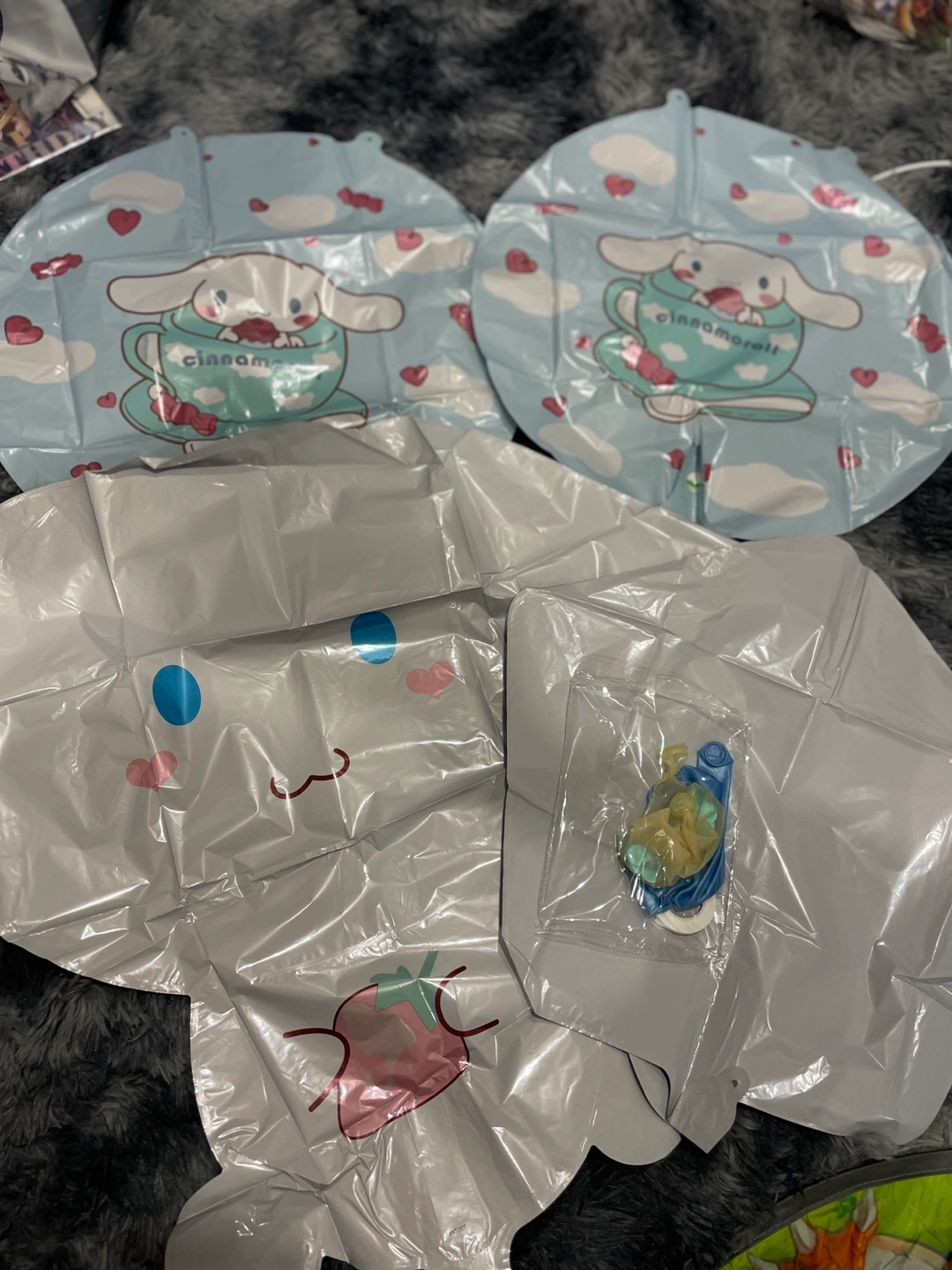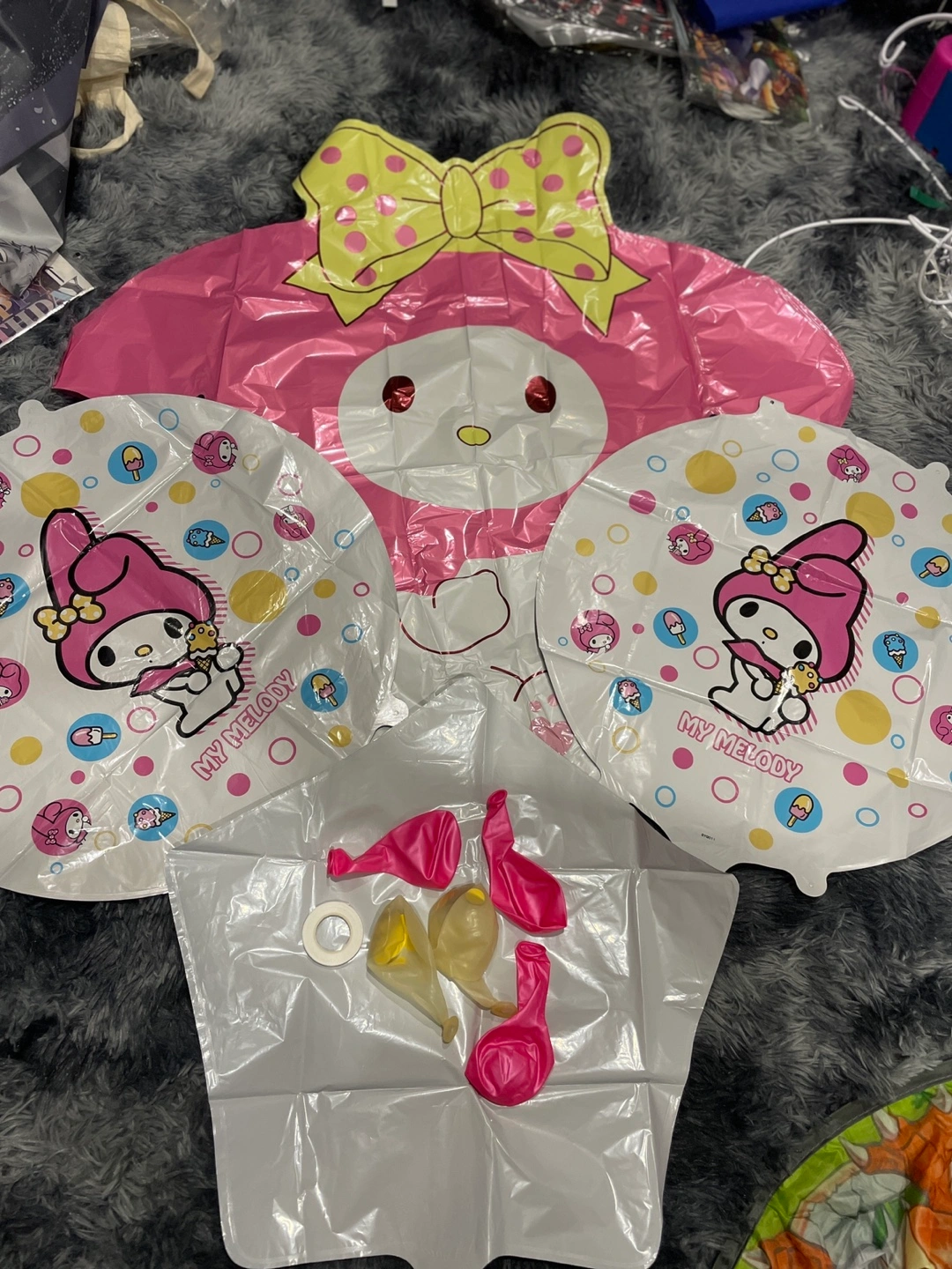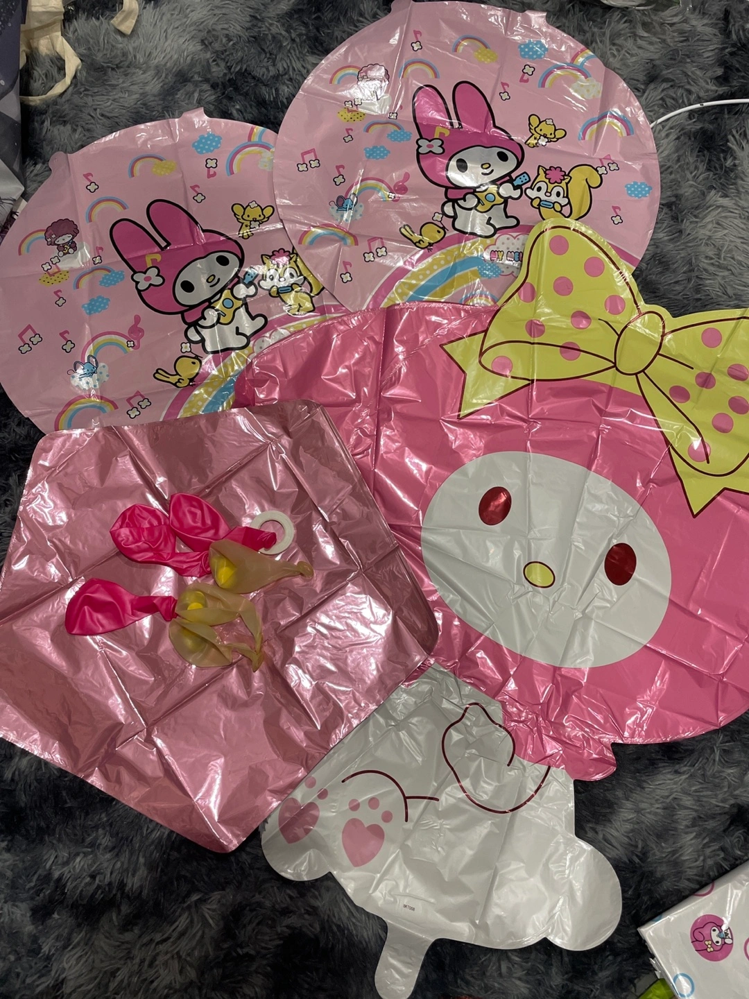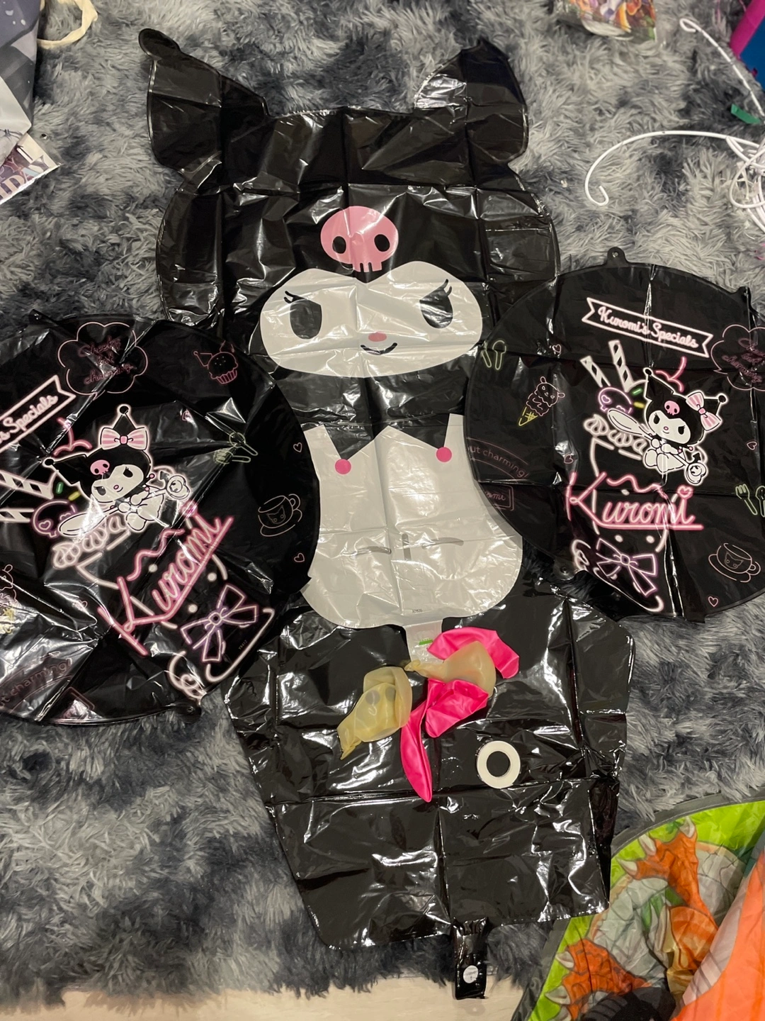 Various Sanrio character themed birthday banners and party supplies. Includes Hello Kitty and Kuromi designs. Banners and decorations available. $10 each.