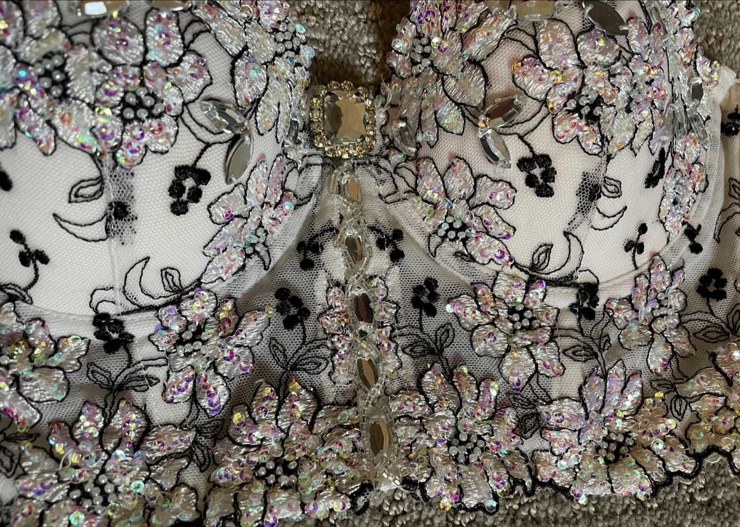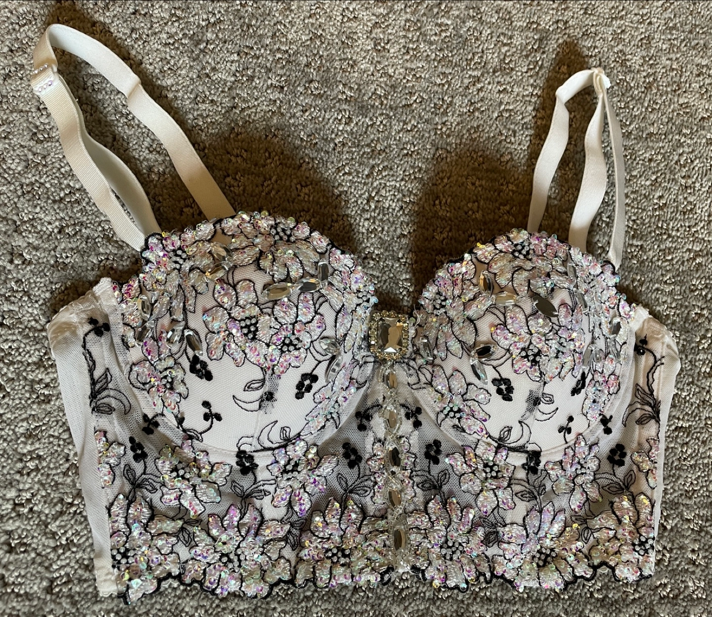 Stunning white bustier with delicate lace and intricate beaded floral detailing. Adjustable straps. Beautiful piece, perfect for a special occasion.