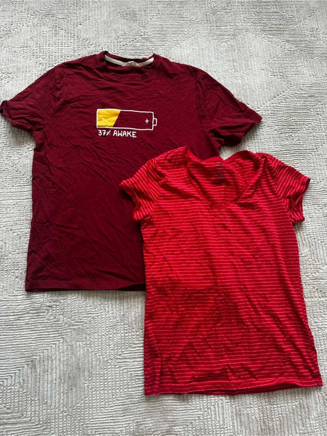 2 T-Shirts: Burgundy "37% Awake" & Red Striped