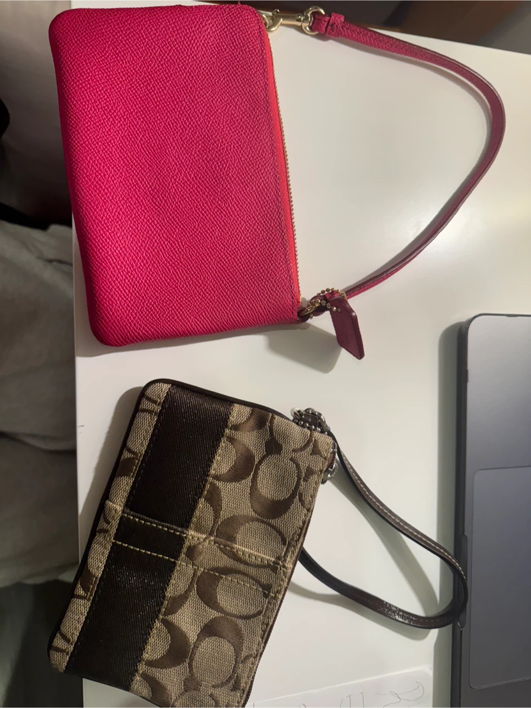 Two Coach wristlets for sale! One is a vibrant pink and the other features the classic Coach logo pattern in brown tones. Perfect for carrying your essentials in style