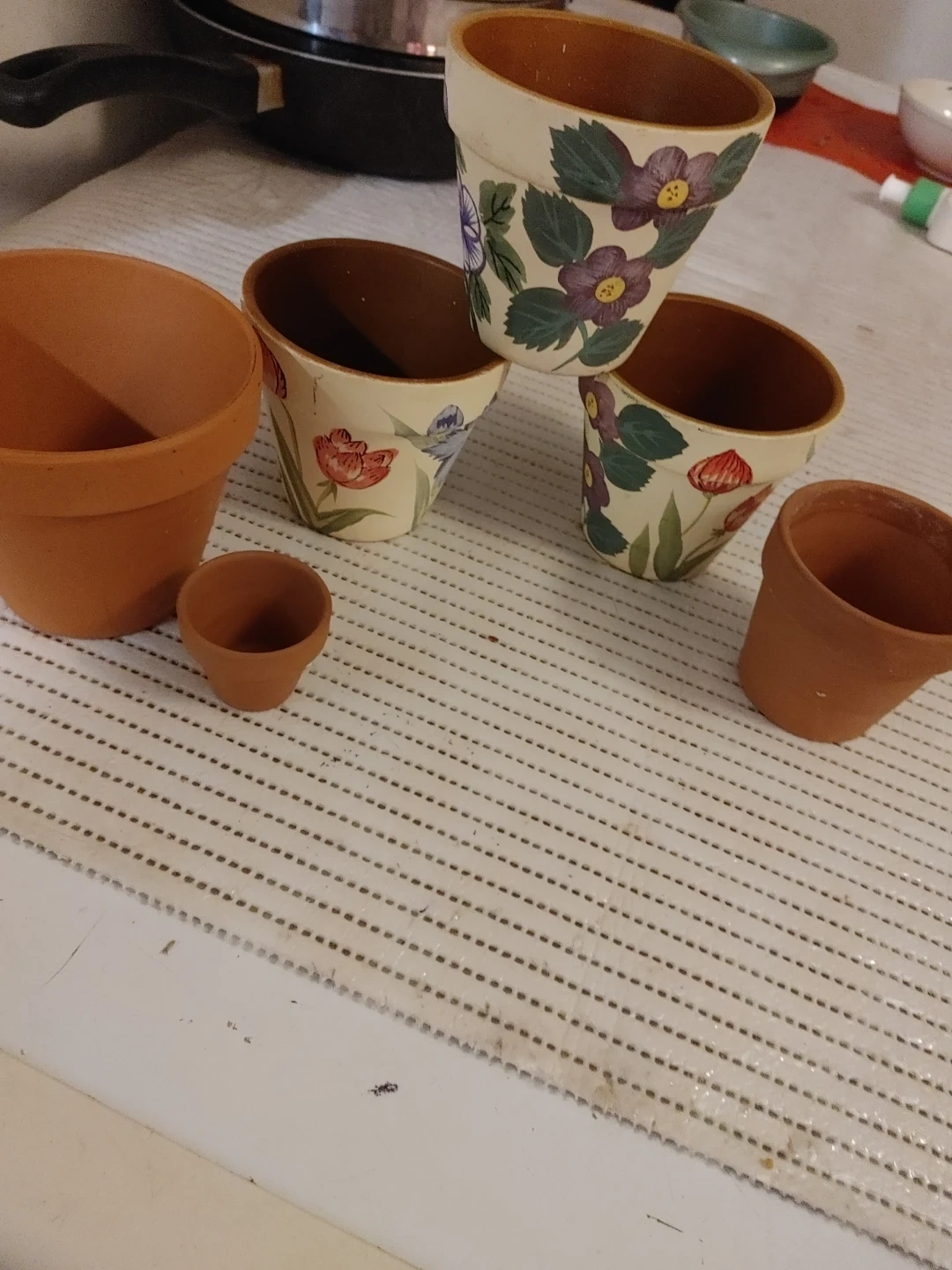 This set includes six assorted pots, some plain terracotta and others painted with floral designs. They're suitable for small plants or starting seedlings. A lovely addition for any gardener!