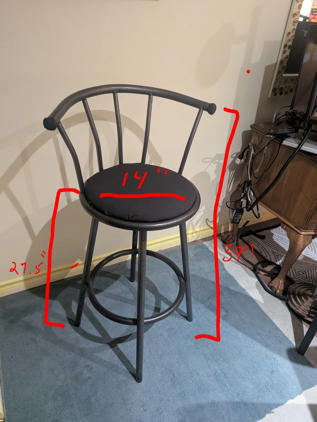 Set of 2 sturdy, modern black metal bar stools with cushioned seats and footrests. Clean, solid, and very comfortable. Great for kitchen islands, bars, or studio spaces. ✅ Swivel seats ✅ Padded cushions ✅ Heavy-duty metal frame ✅ Smoke-free home Measurements a seen in last photo. Seat Height: 27.5" Total Height: 39" Seat diameter: 14" 40$ for the pair. Pickup only. Located in East Vancouver.
