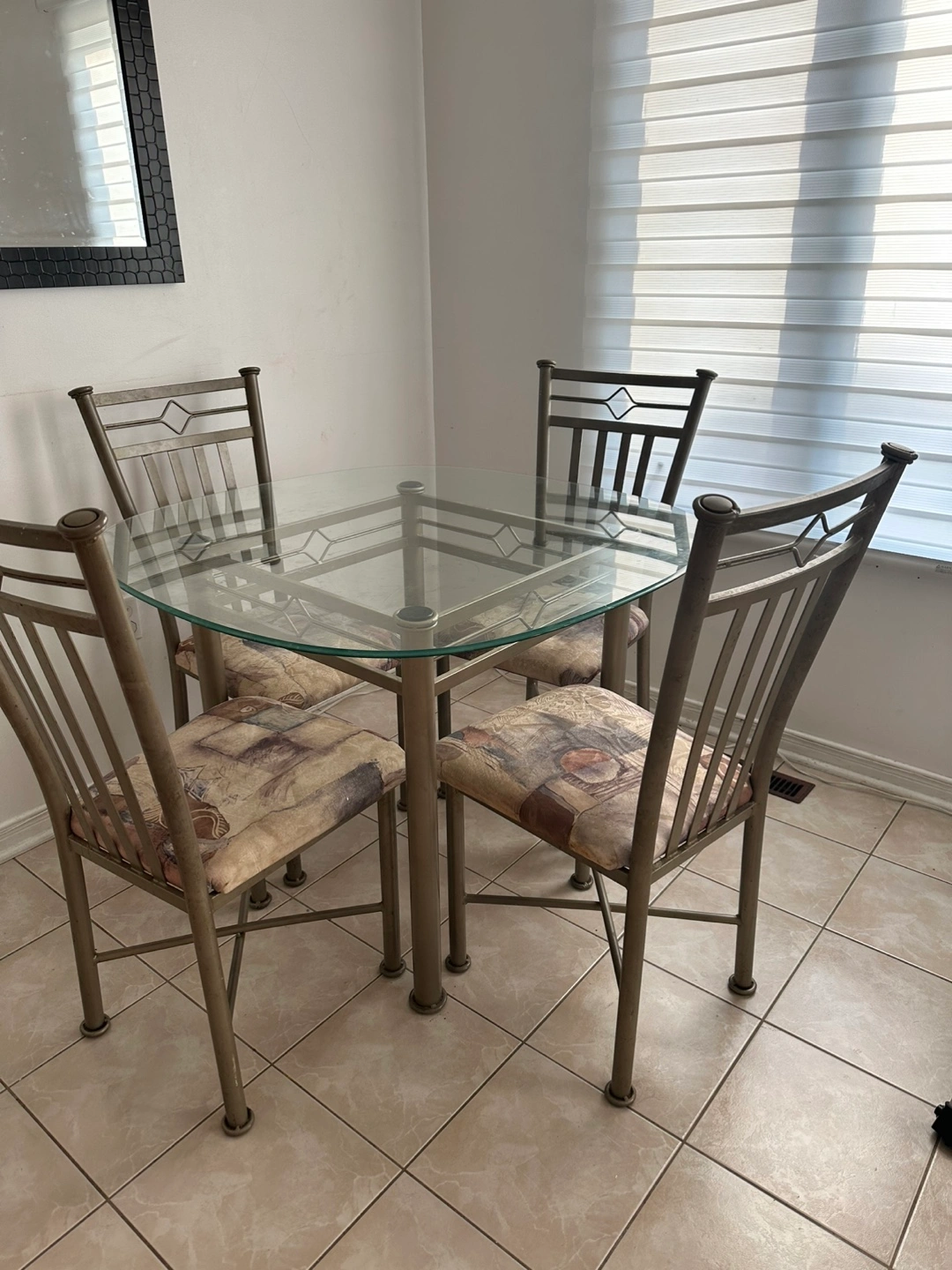 Selling a dining table set that includes a glass top table and four chairs. The chairs have patterned cushions and the table has a metal frame. It's in good condition and ready for a new home!