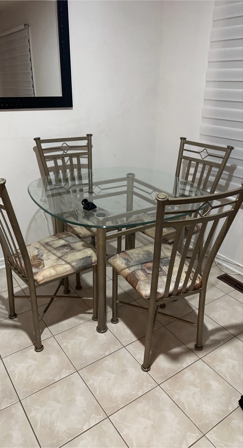 Selling a dining table set that includes a glass top table and four chairs. The chairs have patterned cushions and the table has a metal frame. It's in good condition and ready for a new home!