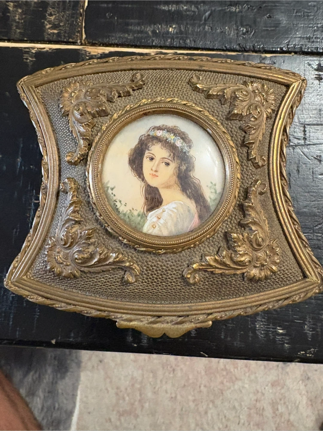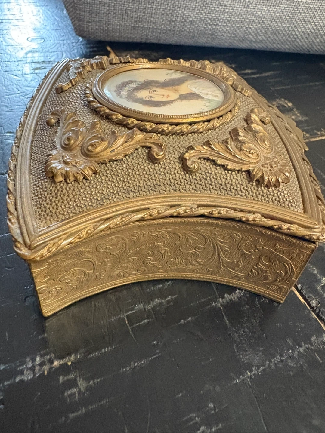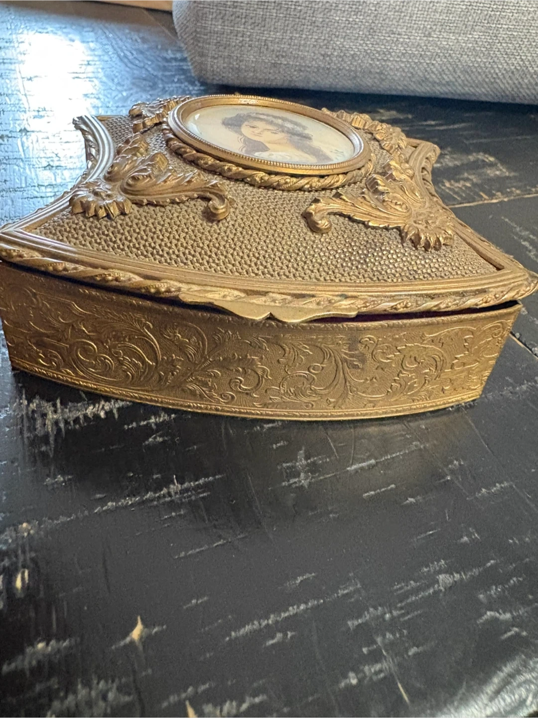 Selling a beautiful vintage jewelry box! It's got a really unique design with an ornate, golden finish and a portrait on the lid. The inside is lined with a soft, red velvet material. It's perfect for storing your precious jewelry or as a decorative piece