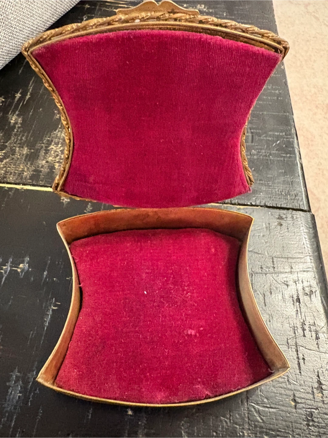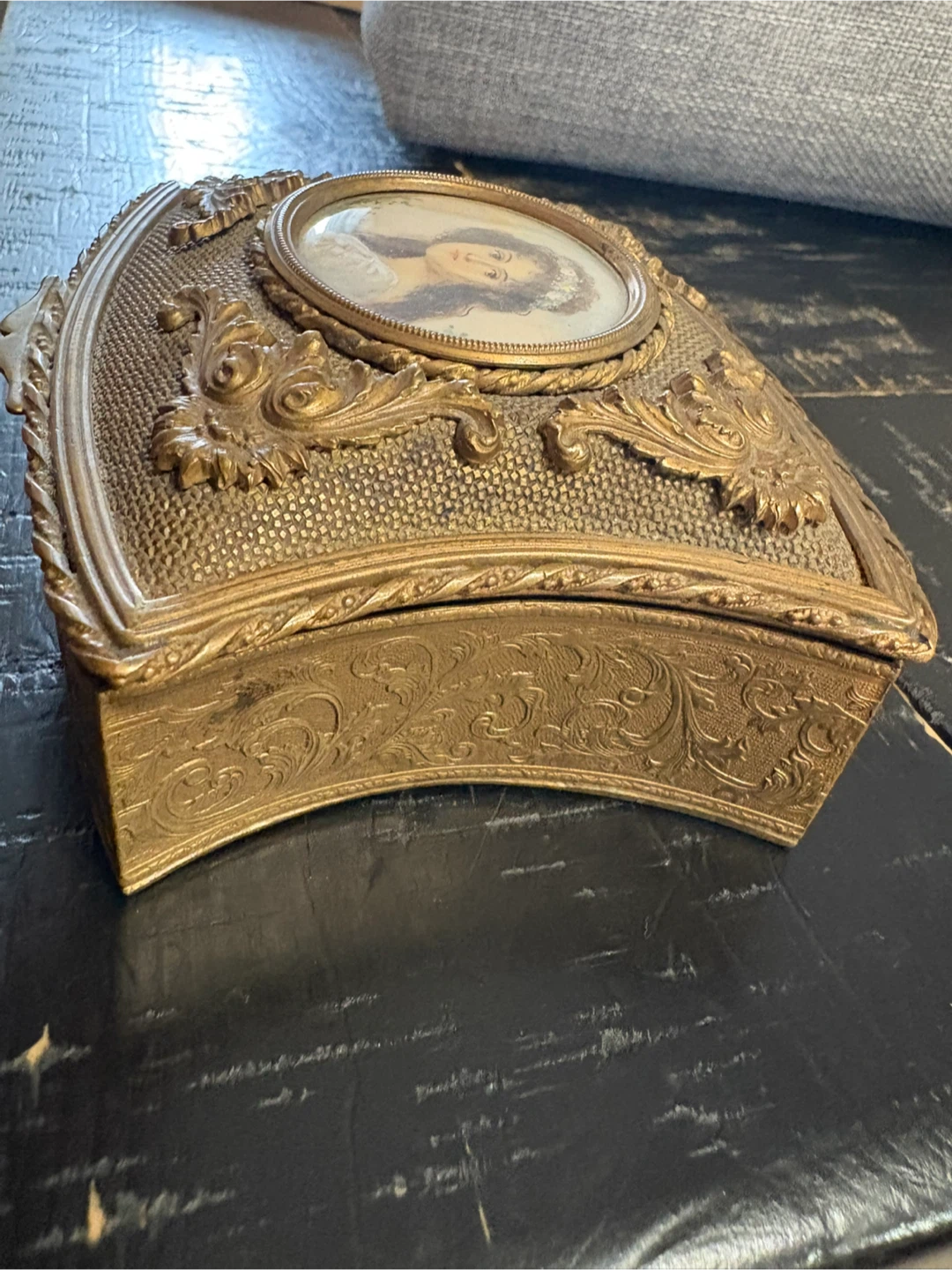 Selling a beautiful vintage jewelry box! It's got a really unique design with an ornate, golden finish and a portrait on the lid. The inside is lined with a soft, red velvet material. It's perfect for storing your precious jewelry or as a decorative piece