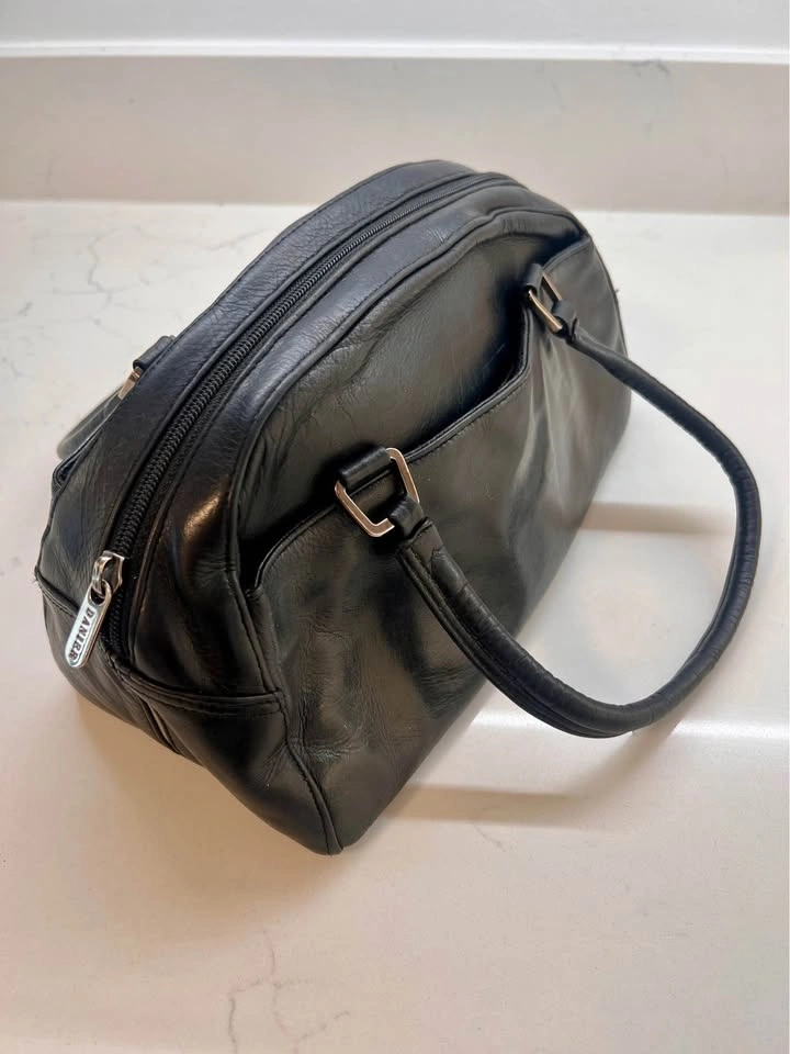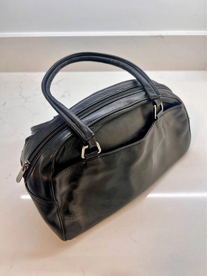 The black leather exterior is in excellent condition. A few scuff marks on the leather interior.