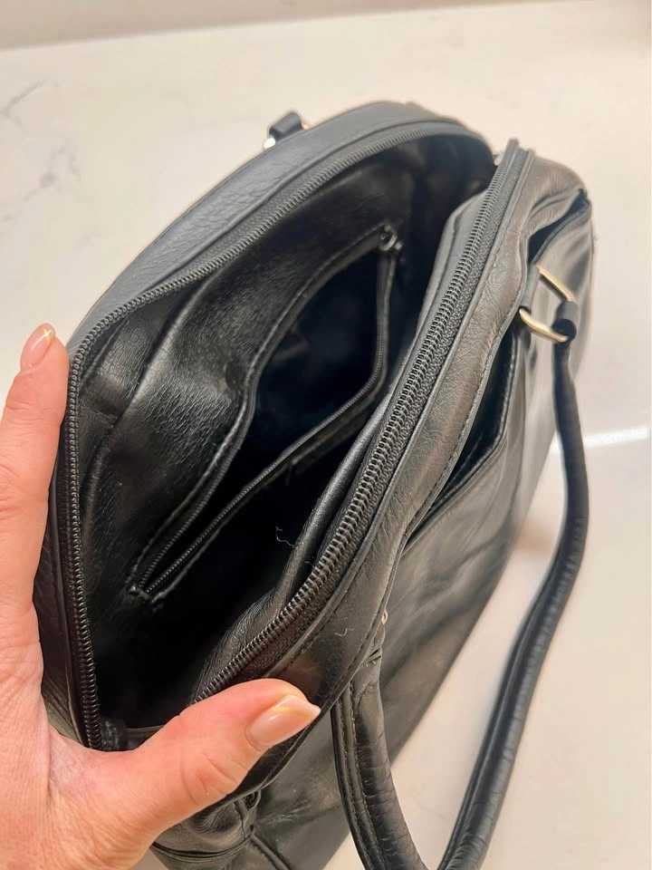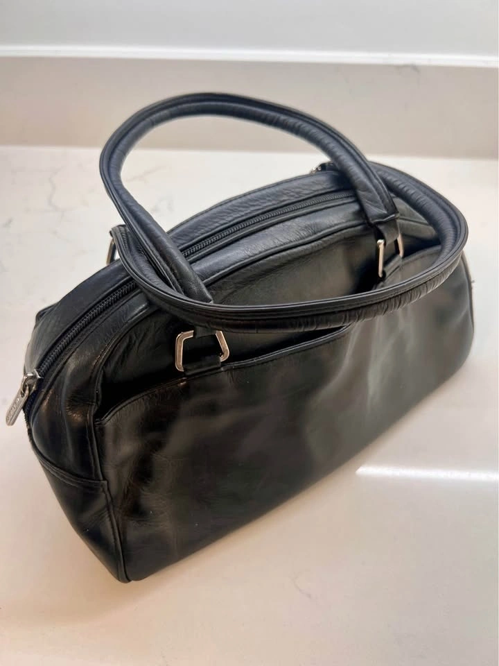 The black leather exterior is in excellent condition. A few scuff marks on the leather interior.