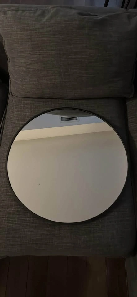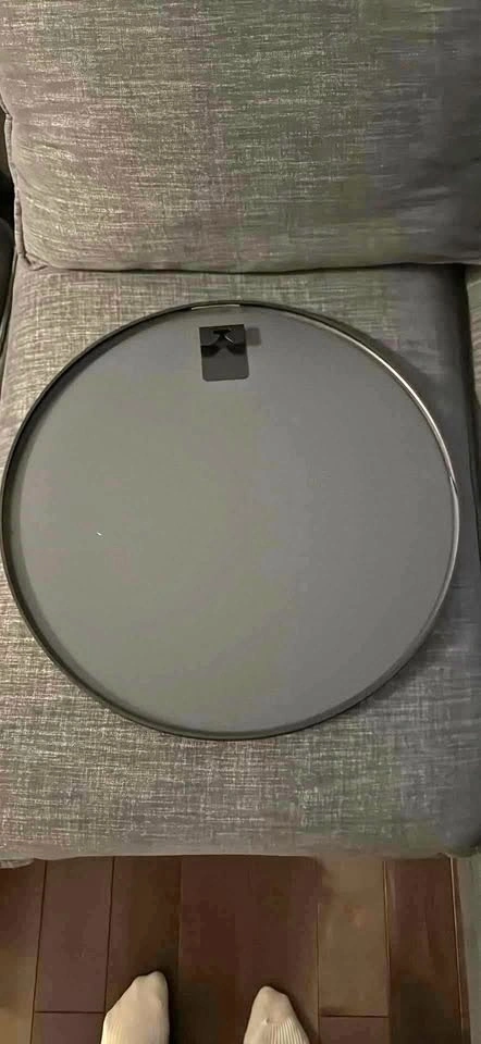 Black round mirror with a thin frame. Attaches to wall with a bracket on the back. In great condition. Selling because no use for it in new place. Retails at $60 before tax.
