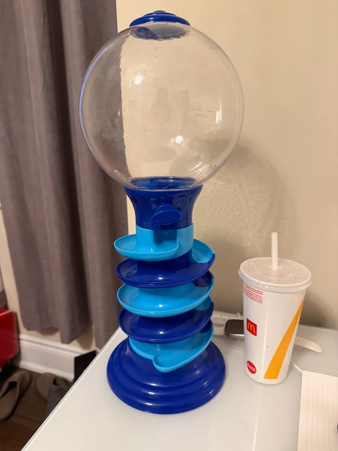 This is a fun gumball machine candy dispenser. It's blue and light blue in colour. It's perfect for holding treats and snacks for kids!