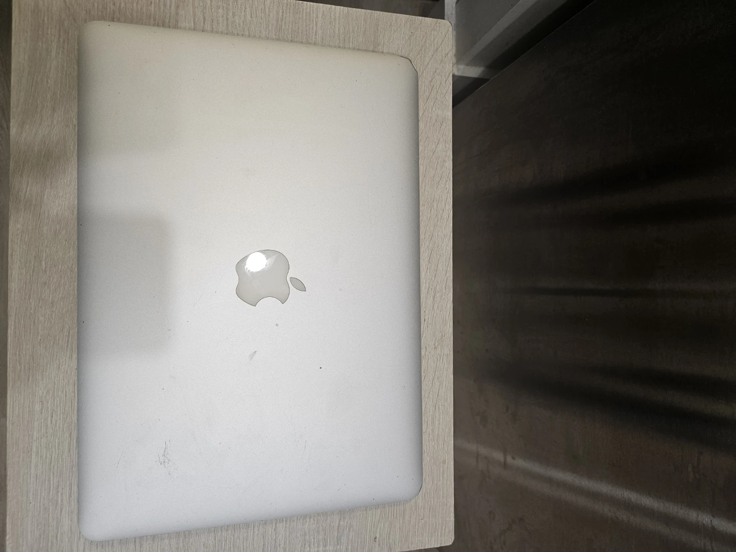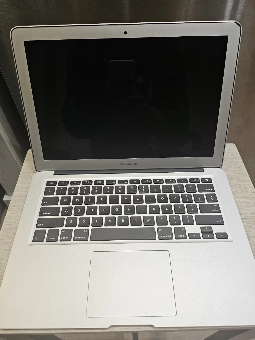 This is a pre-owned Apple MacBook Air laptop. It's a silver aluminum model with a 13-inch screen. It features a standard QWERTY keyboard and trackpad.