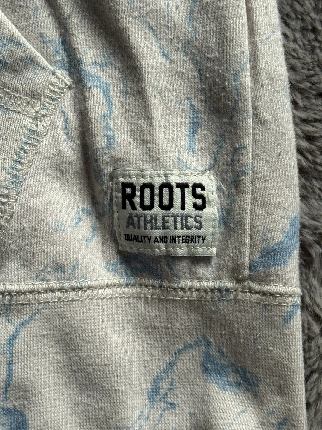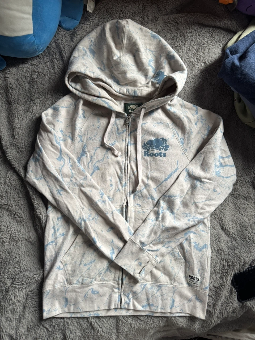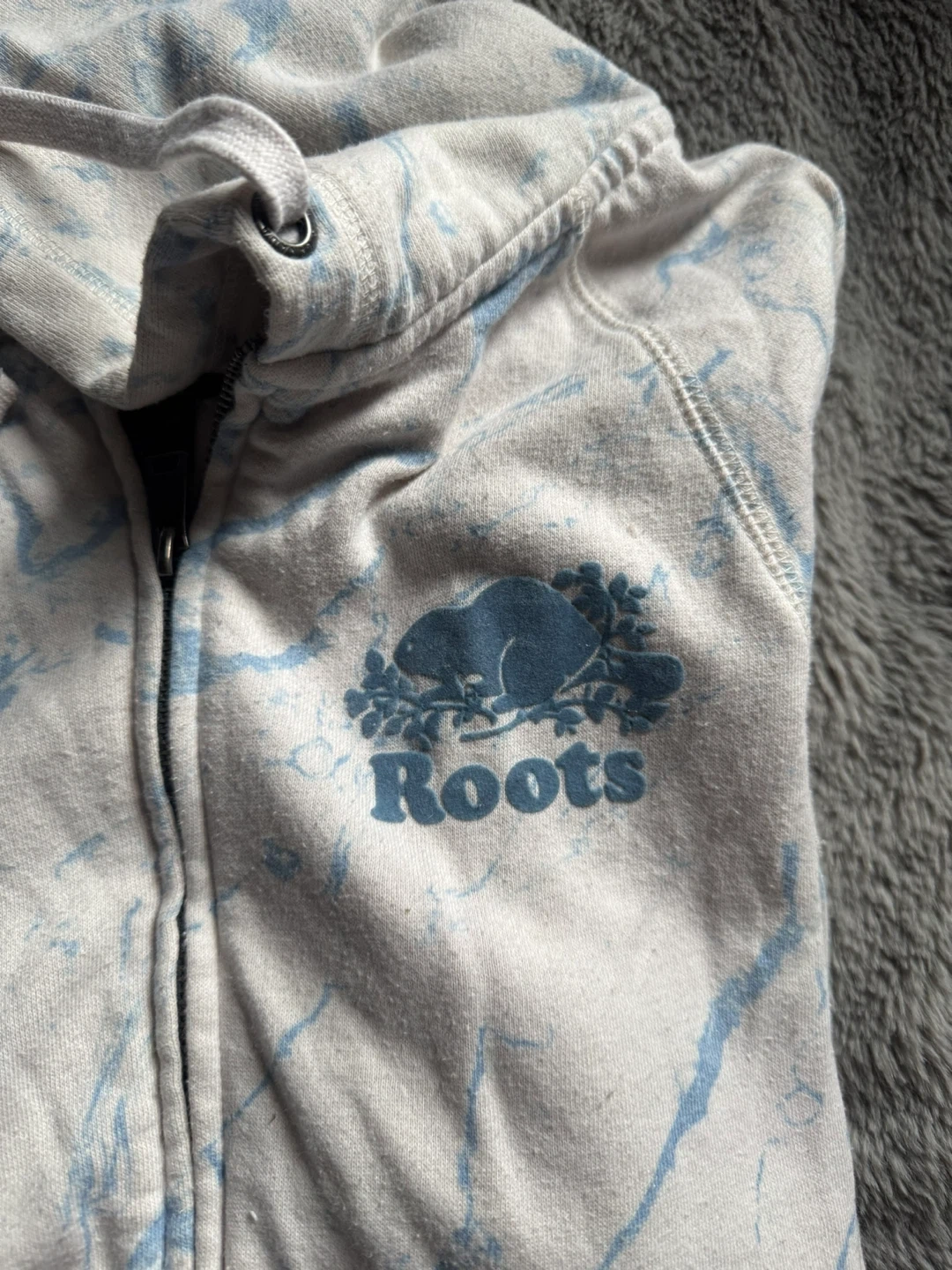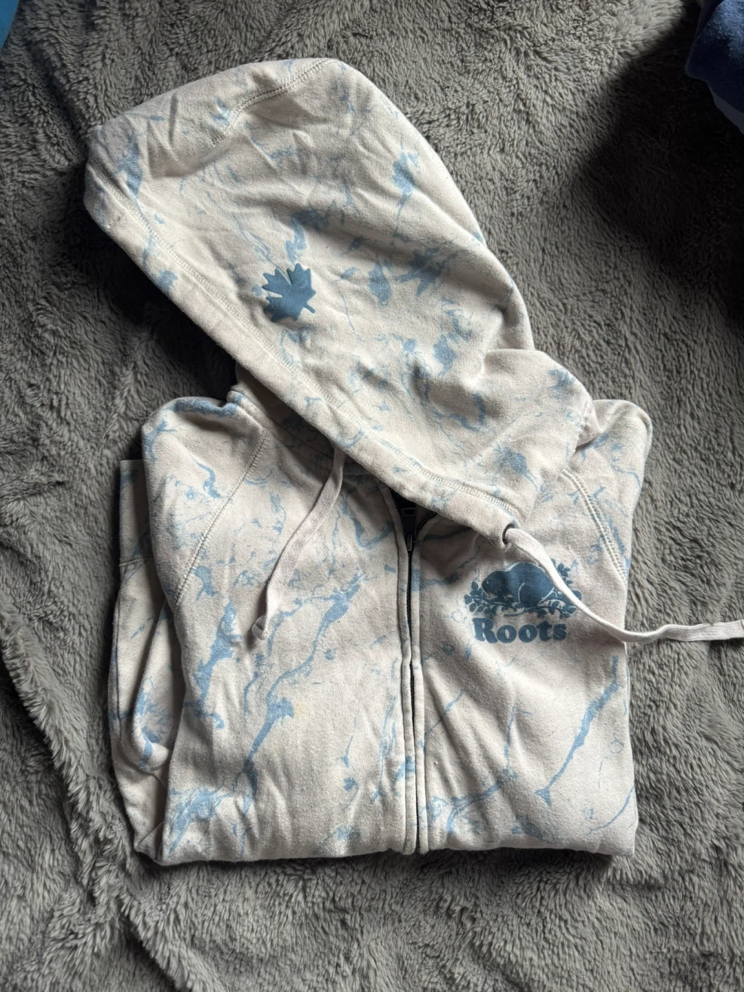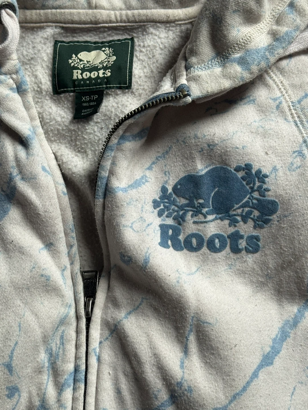 Roots Canada zip-up hoodie with a marble/tie dye pattern. Size Xs (women’s I THINK! But runs bigger like a medium). Has signs of wear and have had for a while