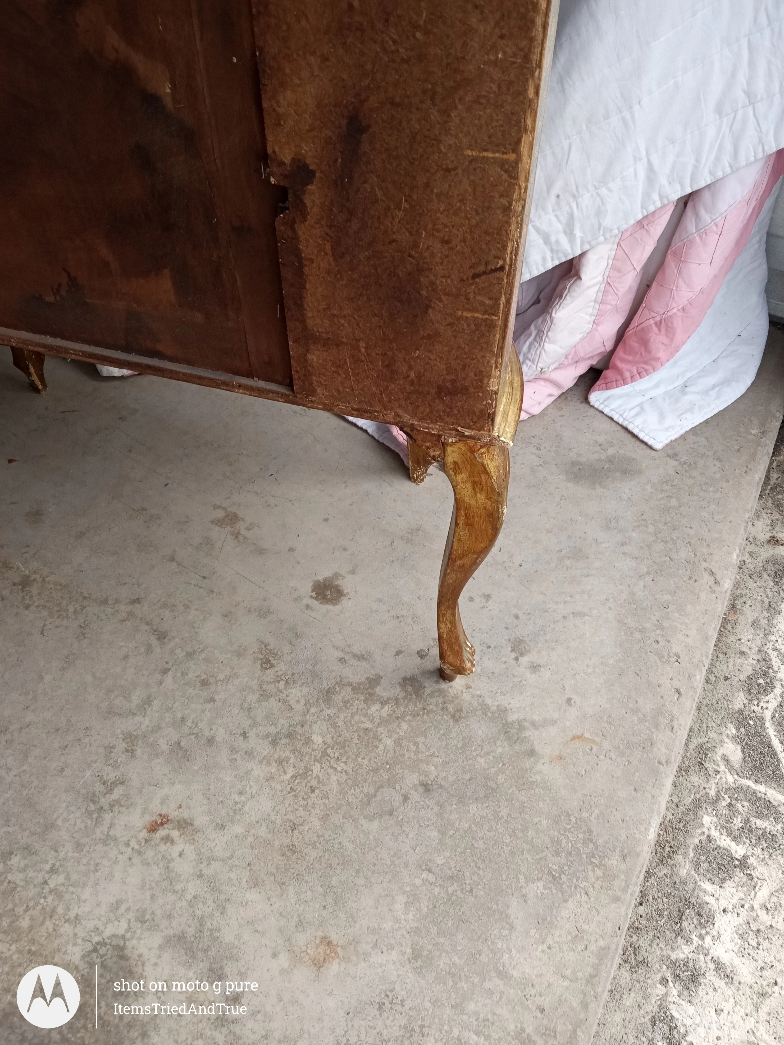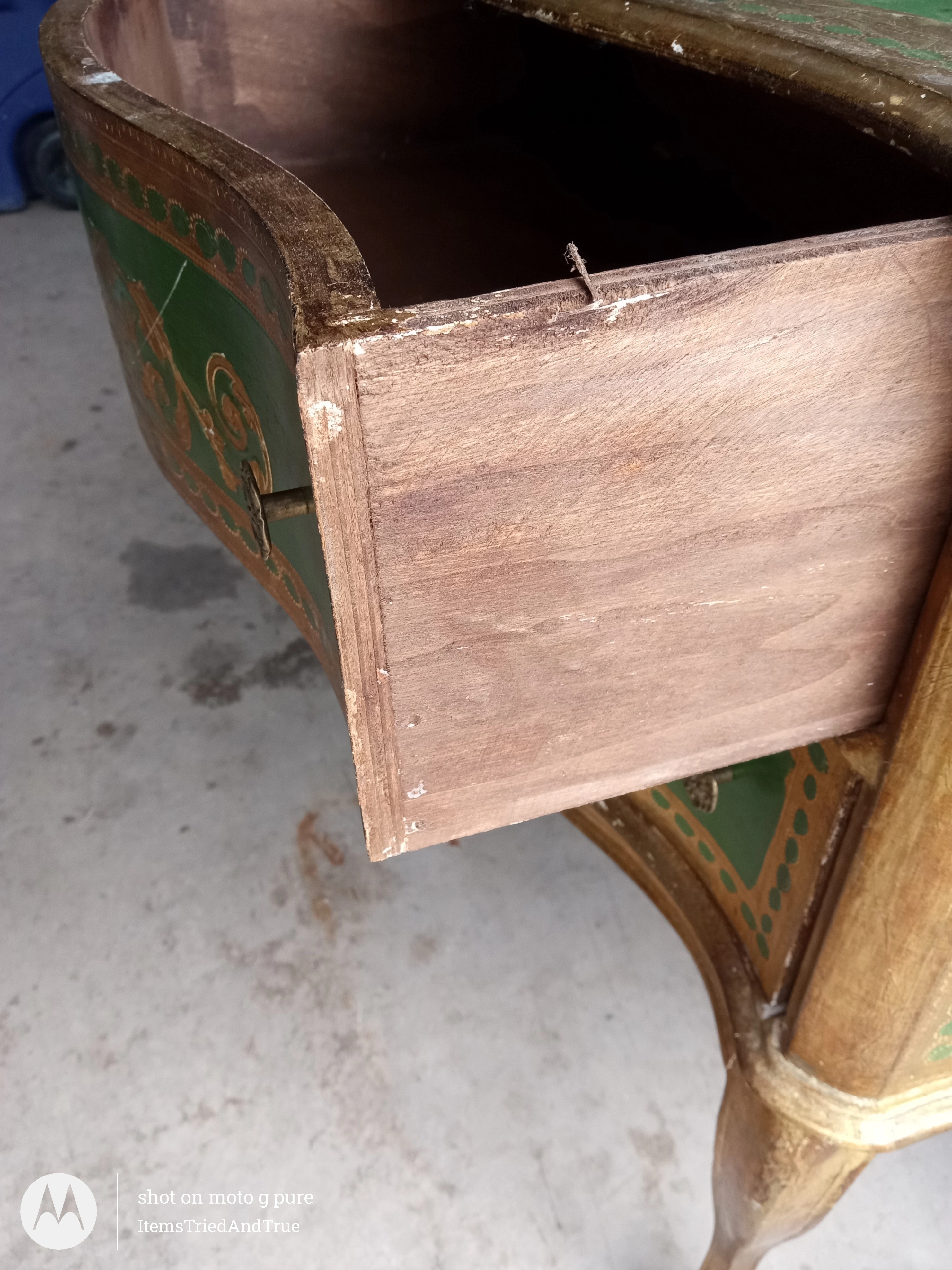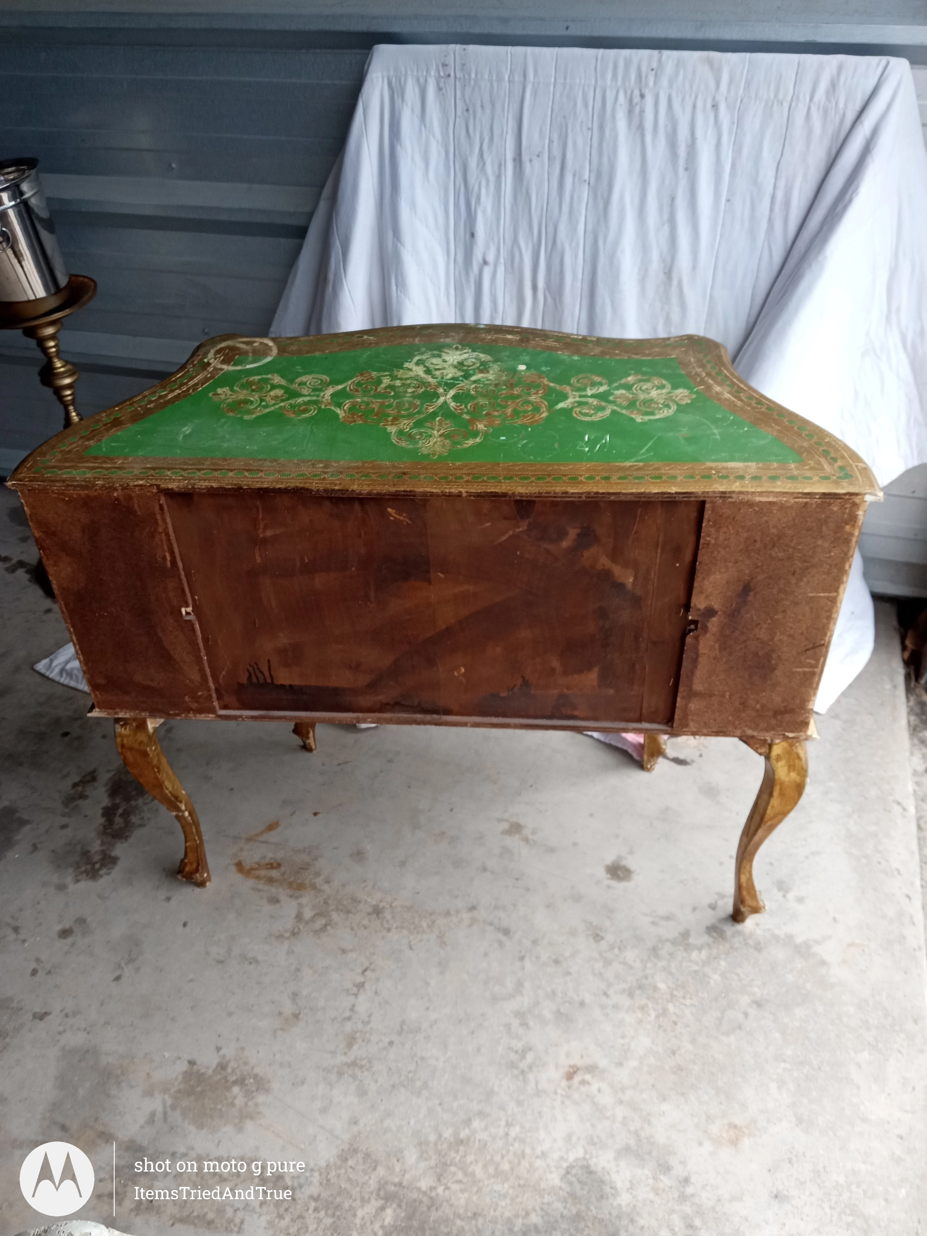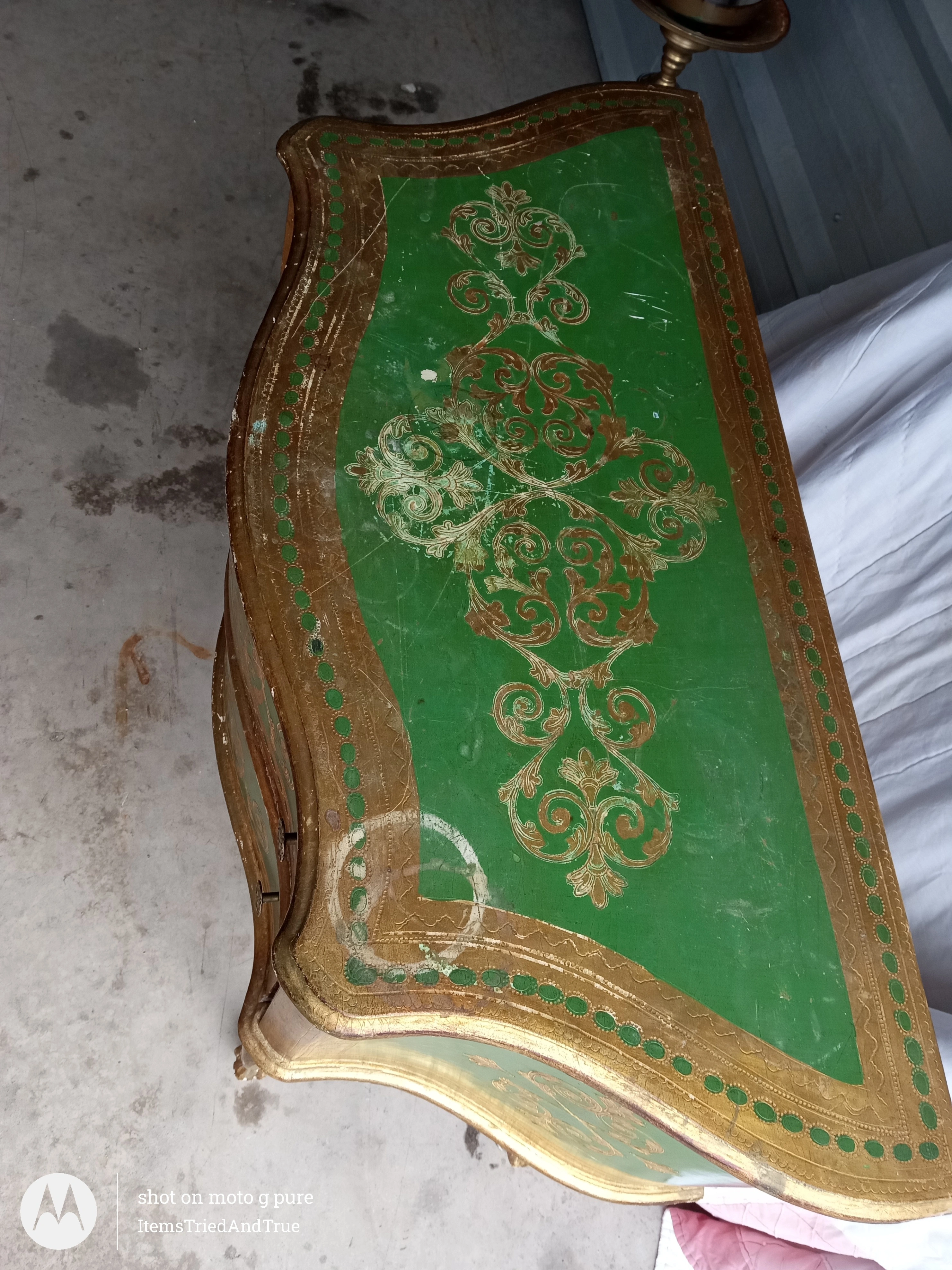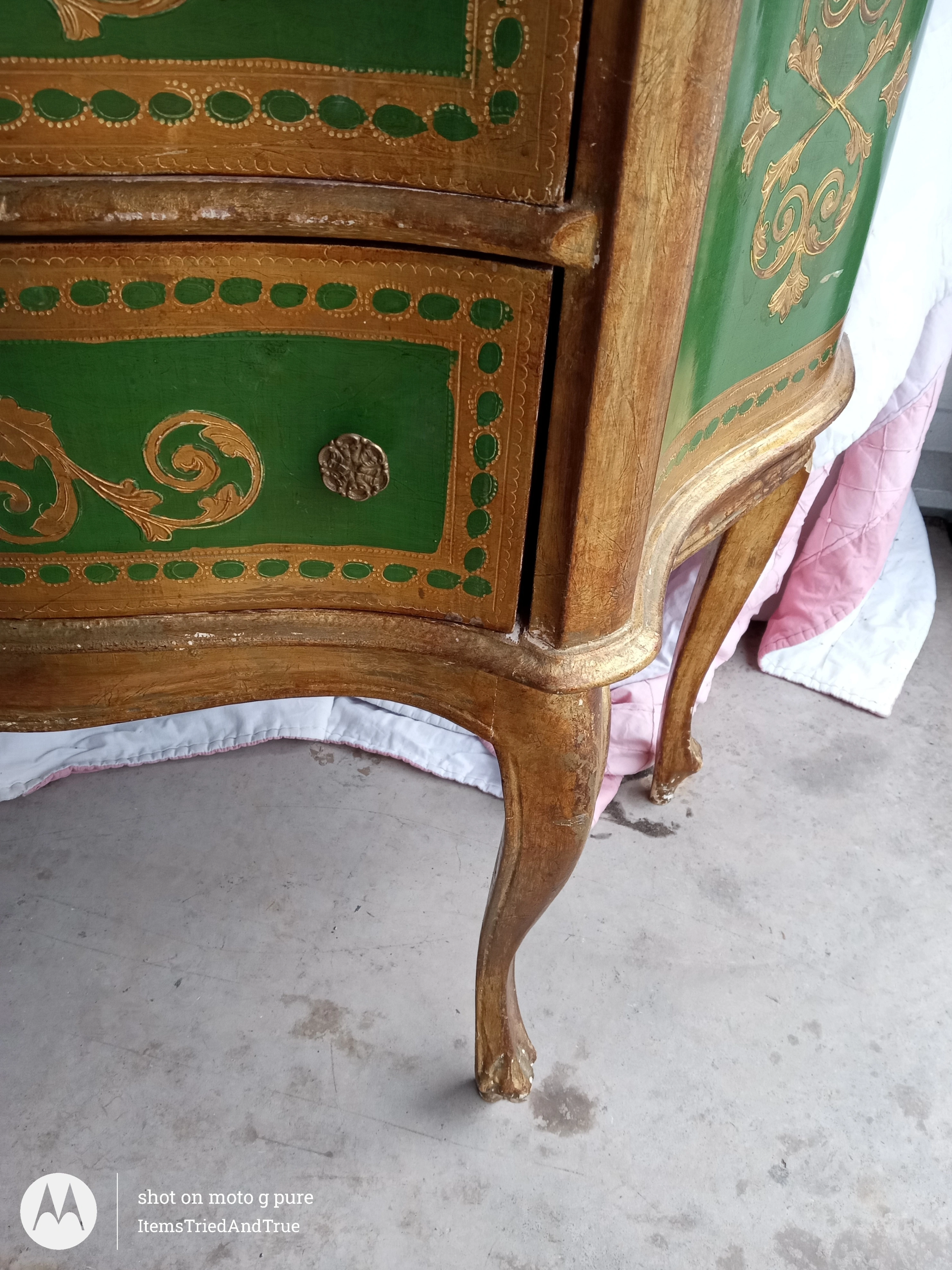 Beautiful vintage green & gold chest of drawers with ornate French‑style detailing. Hand‑painted floral scrollwork, curved front, and carved gold legs make this a standout accent piece for any room.