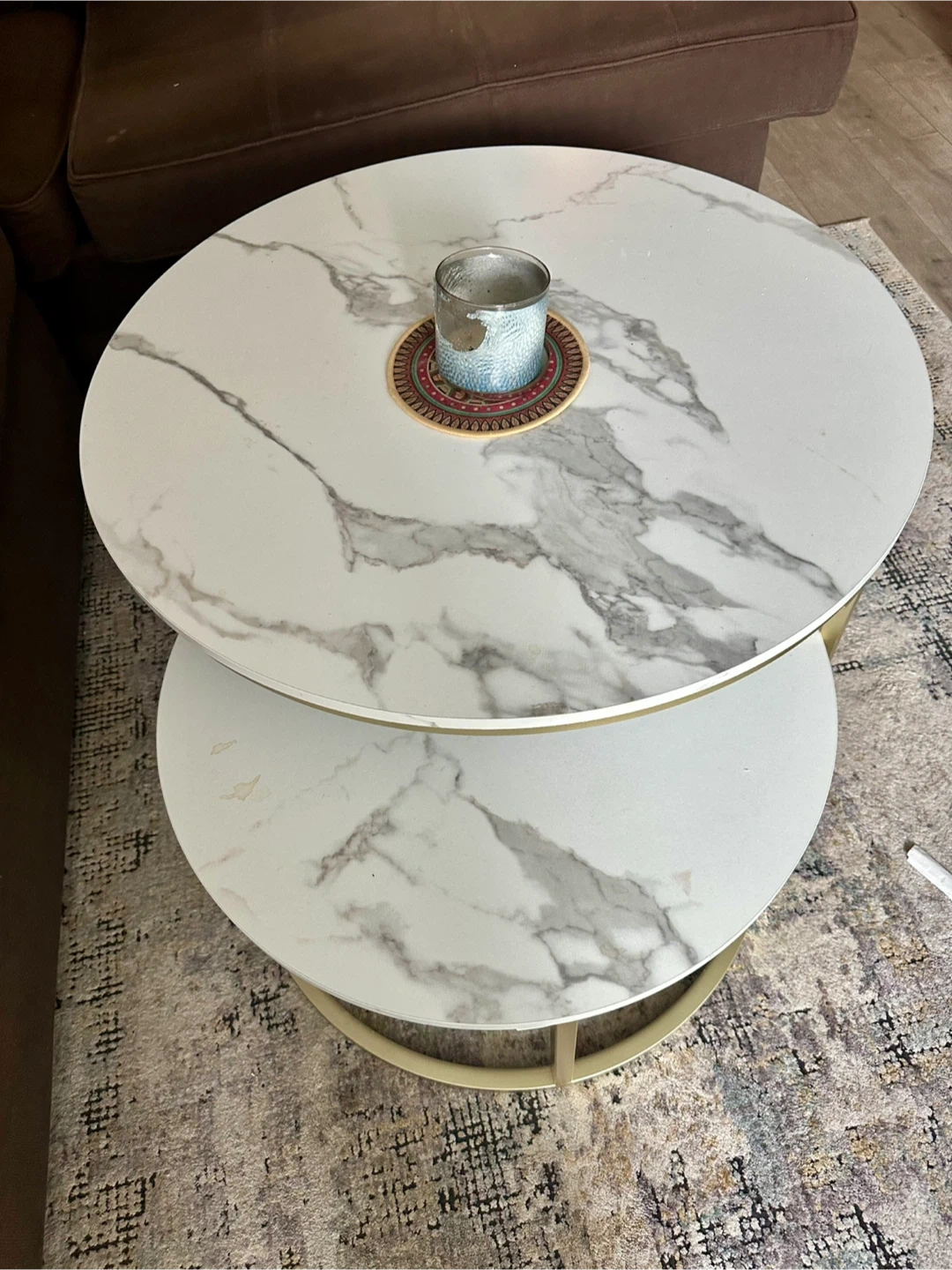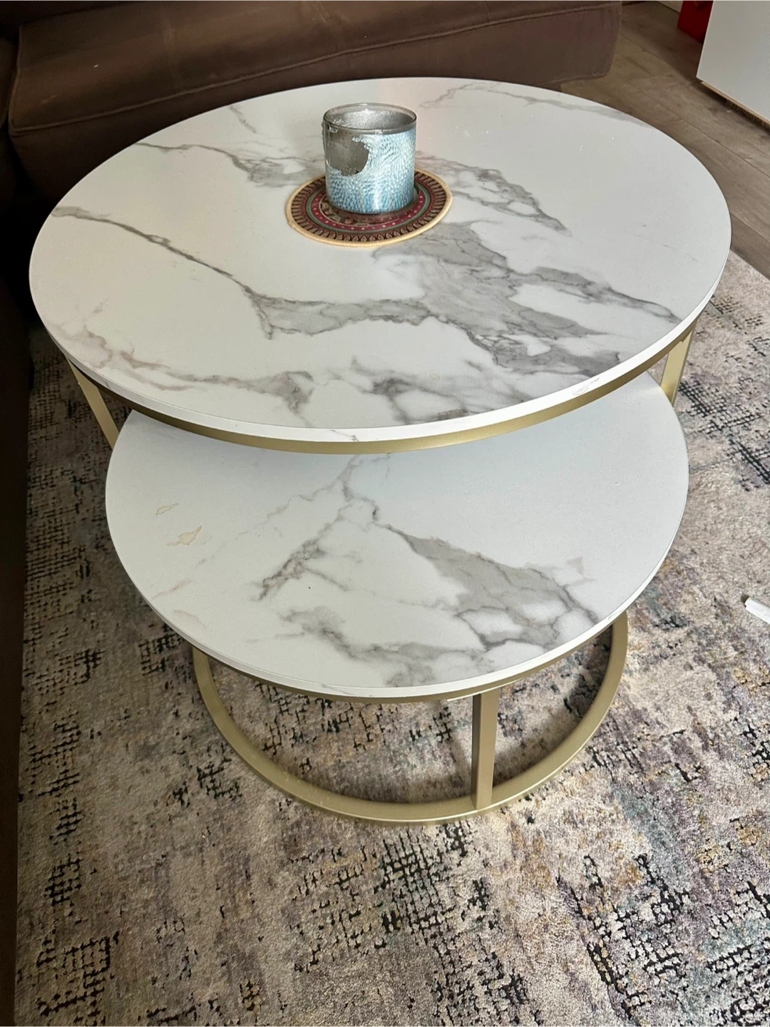 A set of two nesting coffee tables with a faux marble finish and gold metal frames. The larger table has a diameter of 31.5" and a height of 17.7". The smaller table has a diameter of 23.6" and a height of 13.8". These tables can be used together or separately to fit your space needs.